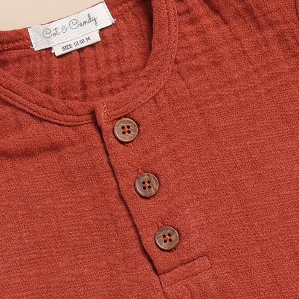 The Cot & Candy Baby Short Sleeve Muslin Henley T-Shirt and Jogger Set combines style, comfort, and sustainability, made from 100% GOTS Certified Organic Cotton that’s soft, breathable, and gentle on delicate skin. The Henley T-shirt features a button-down neckline for easy dressing, while the joggers have an elastic waistband and cuffs for a snug, comfy fit. Both pieces are pre-washed for extra softness and have a naturally wrinkle-finished look for effortless style. Durable, hypoallergenic, and easy to care for, this eco-friendly set keeps your little one cozy and stylish every day.