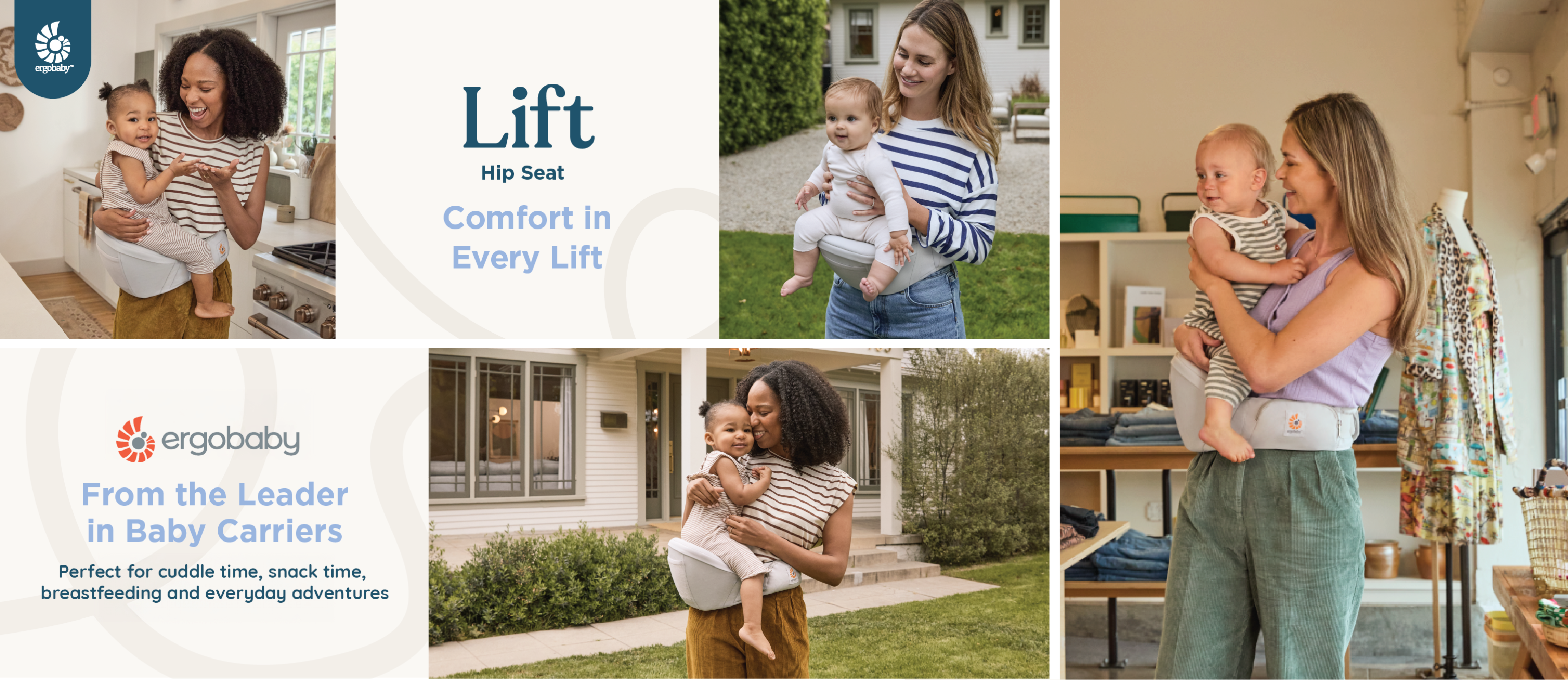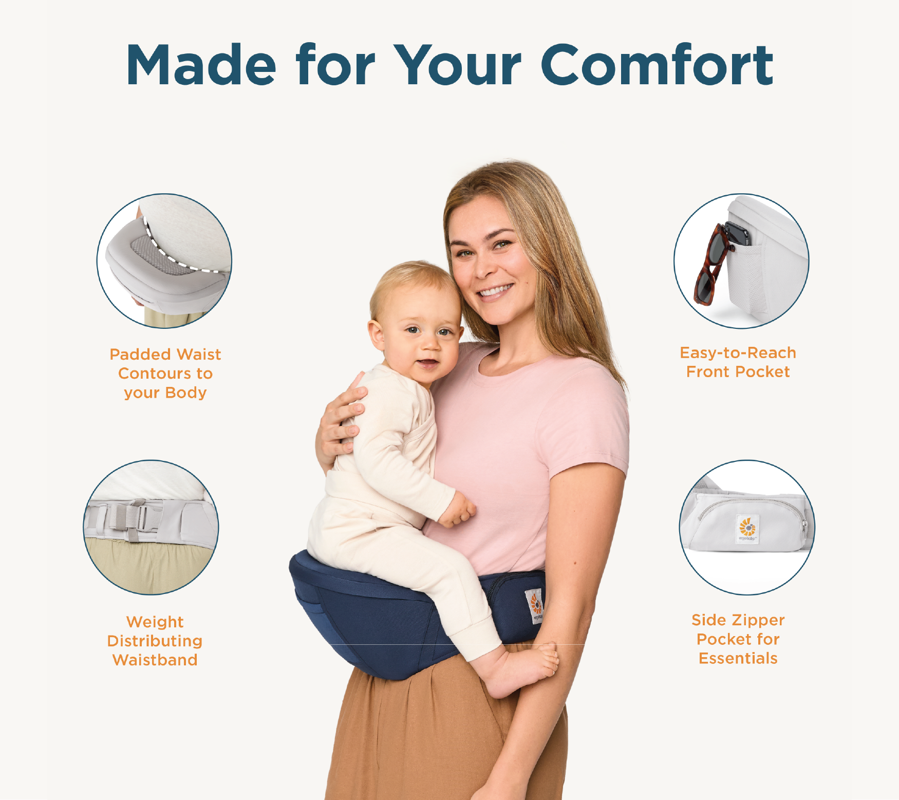 - ERGONOMIC HIP CARRY AND SEAT : Expertly designed oncaved, cushioned seat supports baby’s hips and legs; Keep-Baby-Close™ angle and anti-slip grip keep baby in place.