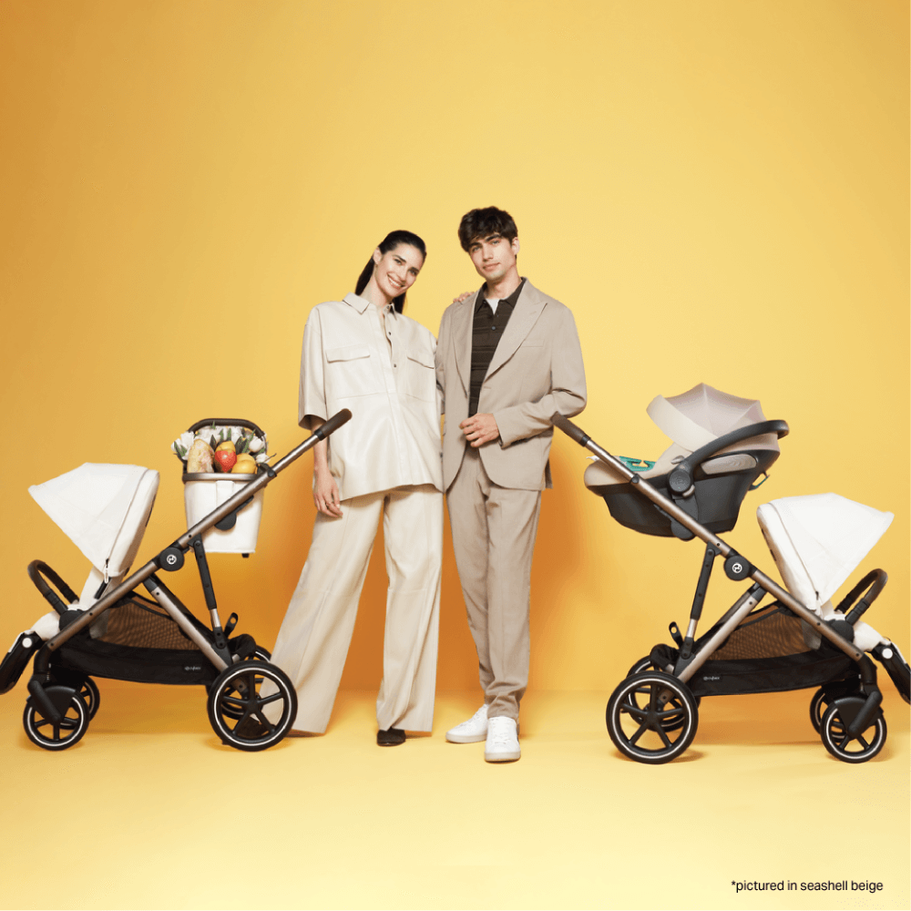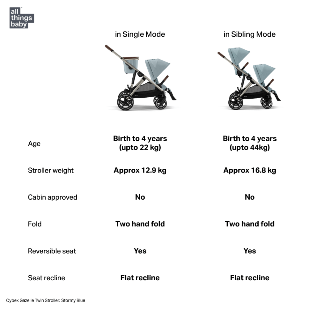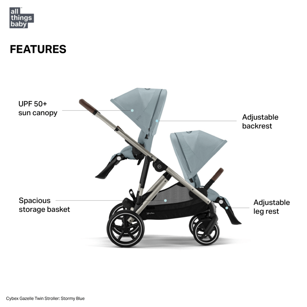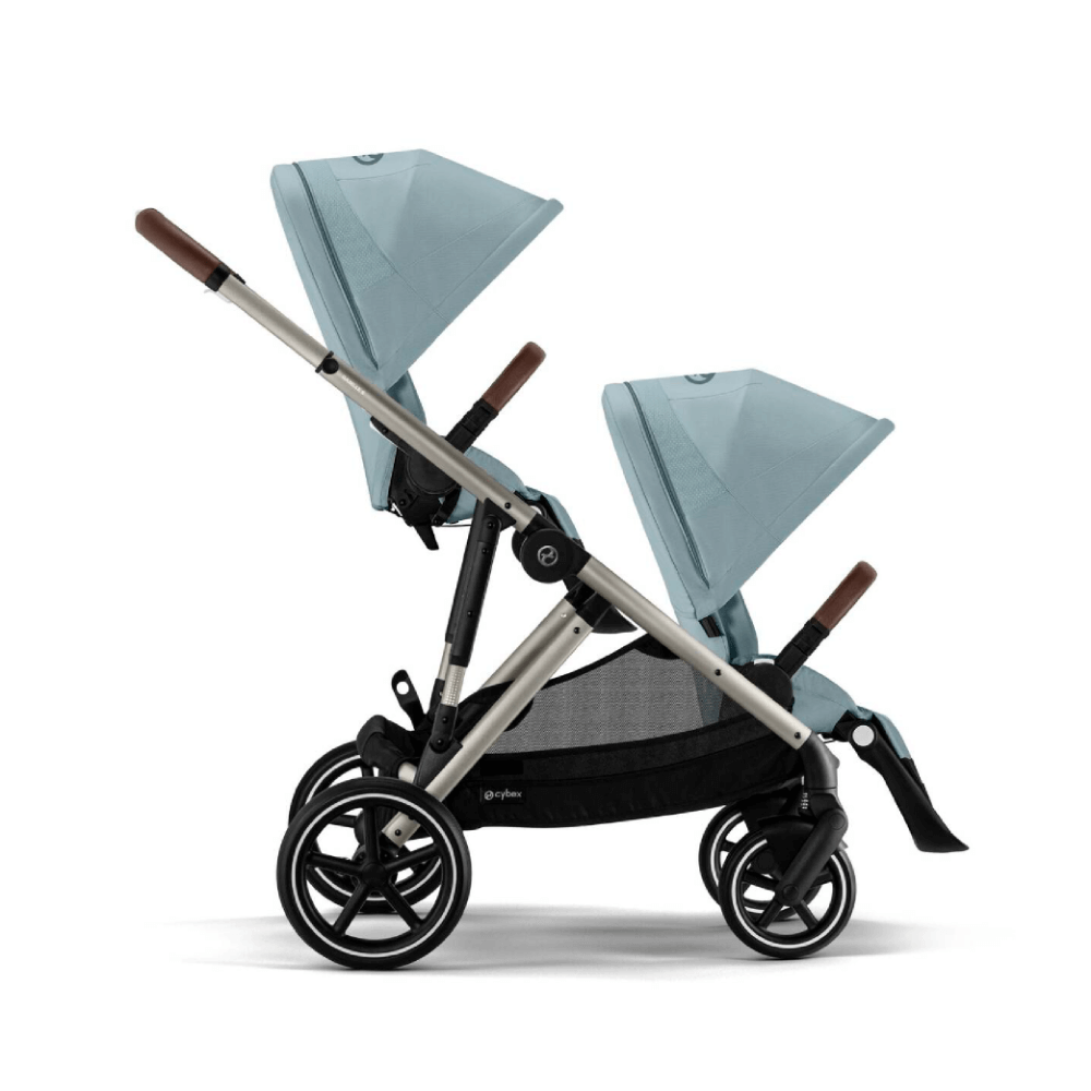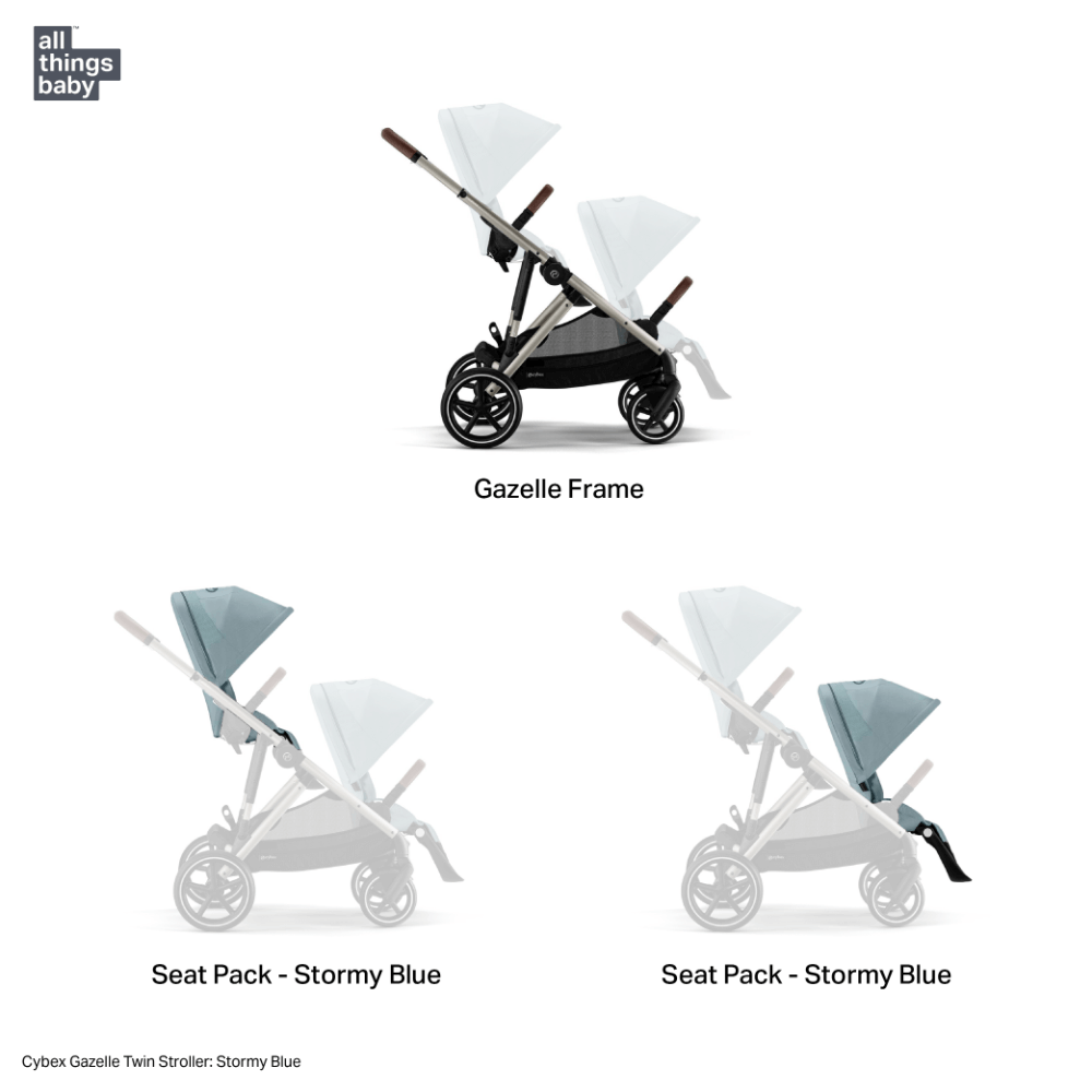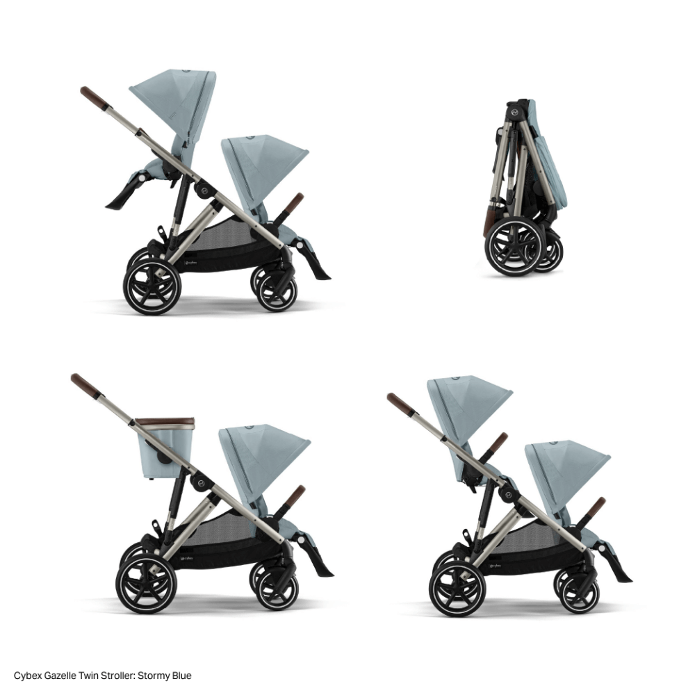 The Cybex Gazelle stroller is designed to easily convert from a single to a double stroller that is suitable from birth to 4 years. With over 20 seat configurations and reversible seat packs that switches from rear to forward facing, the stroller accommodates the evolving needs of parents with a 5-point safety harness, adjustable legrest, and a flat recline.