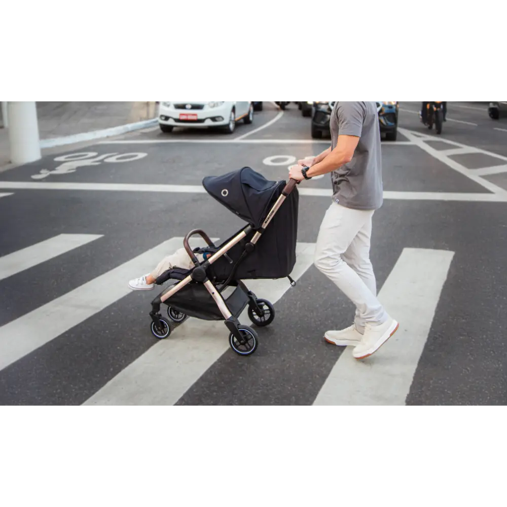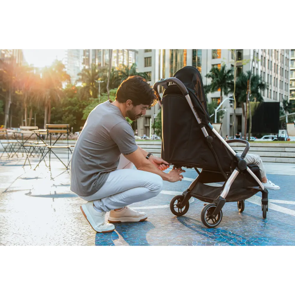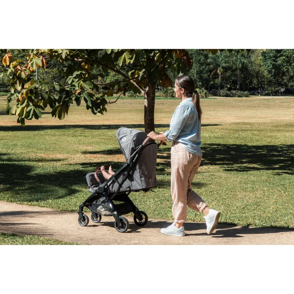 Along with the compact design, Eva³ provides an extra-wide padded seat with full lie-flat recline, suitable from new-born to 4 years. An extendable UPF 50+ ventilated canopy with a mesh peek-a-boo window ensures comfort and protection, while large puncture-proof wheels and soft 4-wheel suspension offer a smooth ride on any urban terrain.