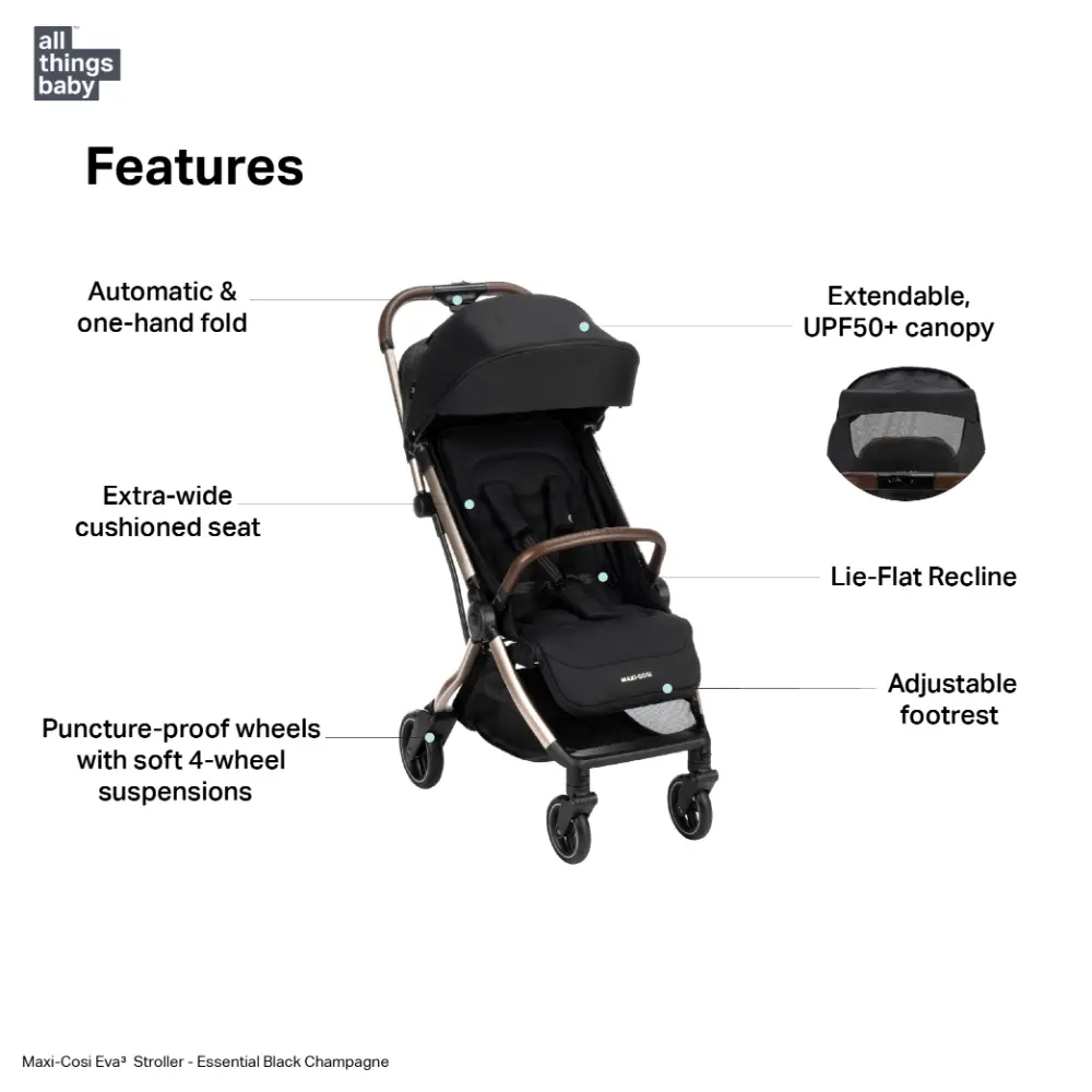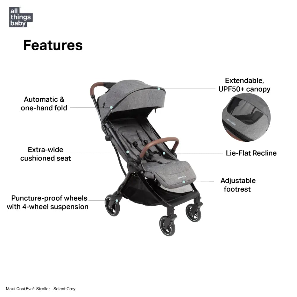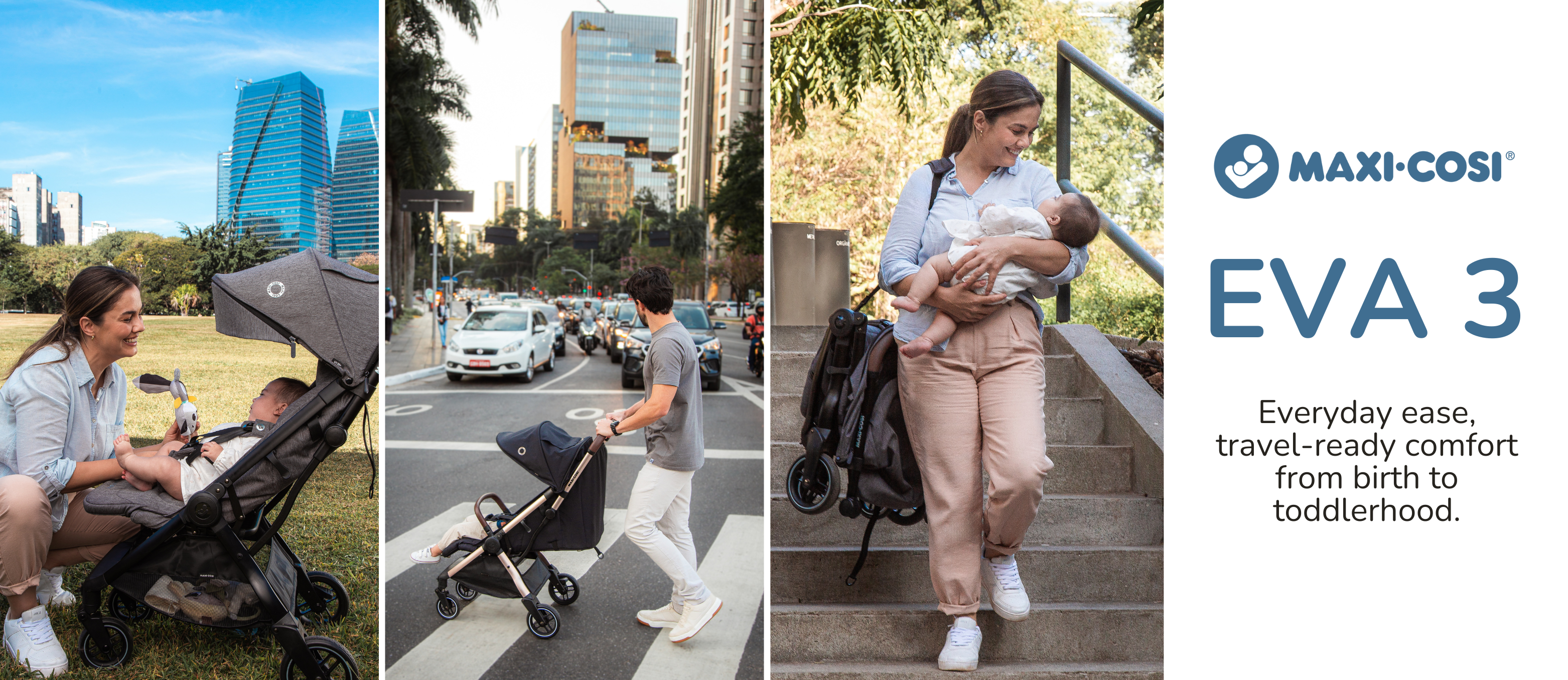 The Maxi-Cosi Eva³ is a modern, lightweight stroller built for travel and everyday adventures. Ultra-compact and simple to manoeuvre, it features an automatic one-hand fold that's folds within seconds. With its comfortable carry strap, Eva³ moves effortlessly with you.