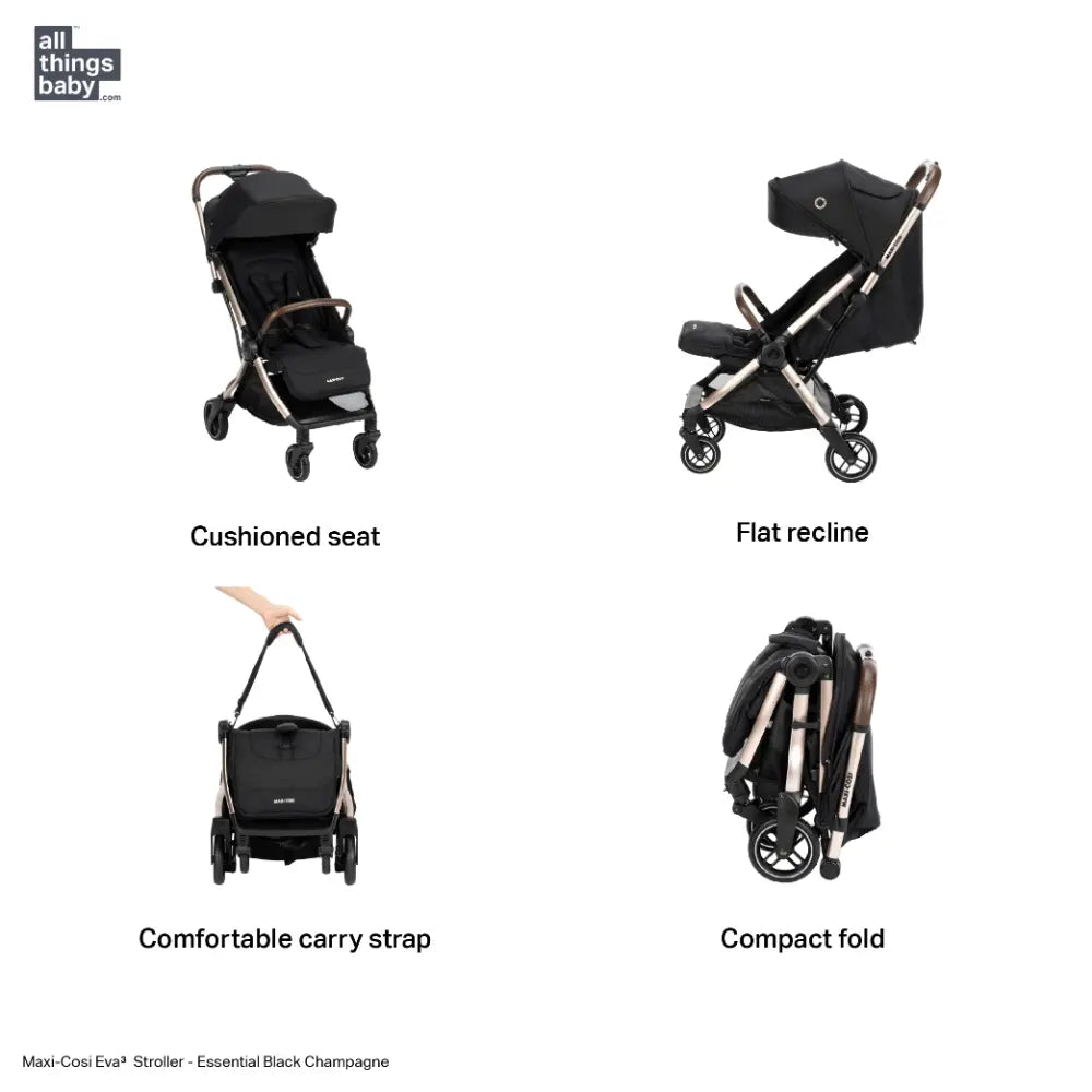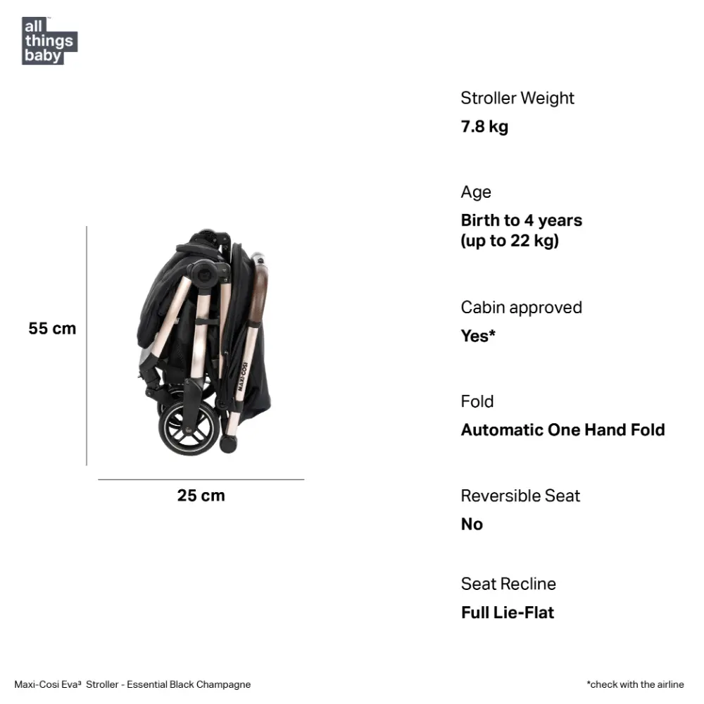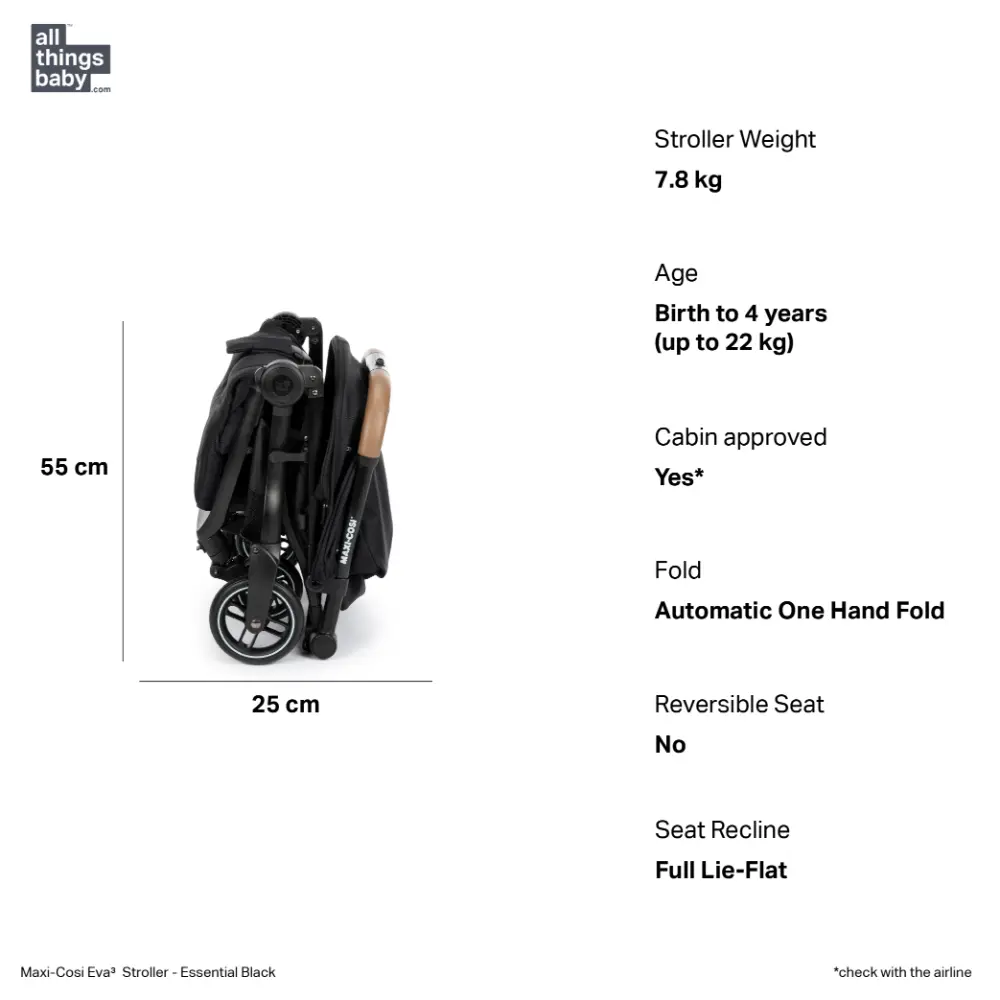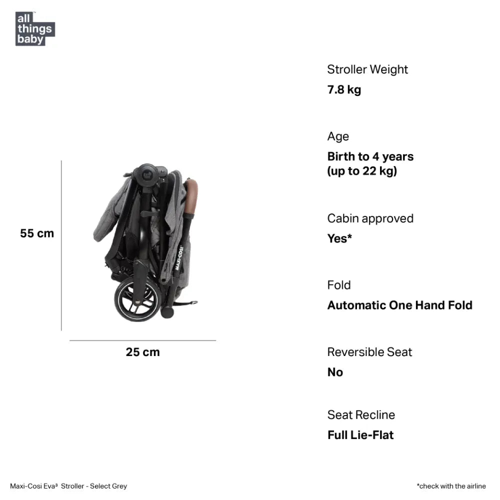 The Maxi-Cosi Eva³ is a modern, lightweight stroller built for travel and everyday adventures. Ultra-compact and simple to manoeuvre, it features an automatic one-hand fold that's folds within seconds. With its comfortable carry strap, Eva³ moves effortlessly with you.