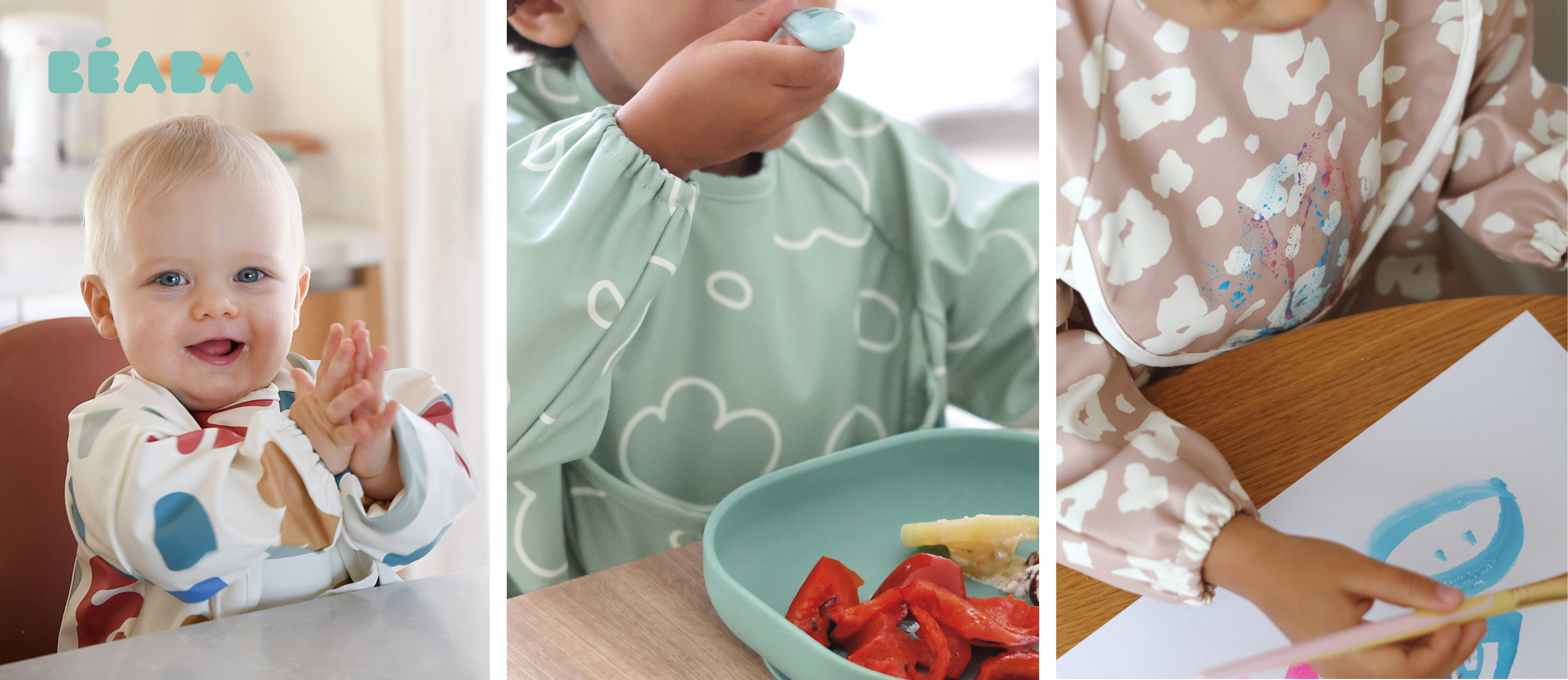 Beaba 2-in-1 Waterproof Bib with Detachable Sleeves, Foldable Food Catcher Pocket, Adjustable Snap Fit & Elastic Cuffs, Soft & Easy-Clean Bib for Feeding & Activities, 4M+