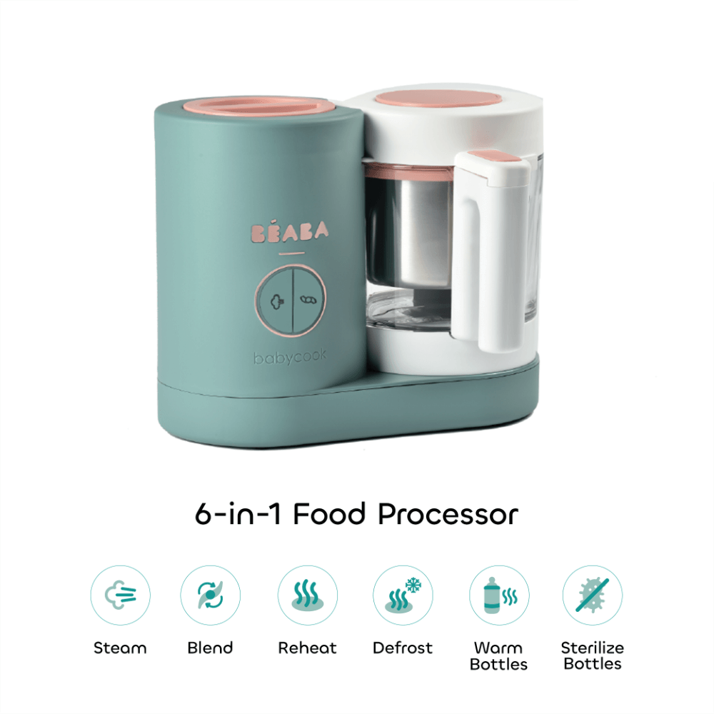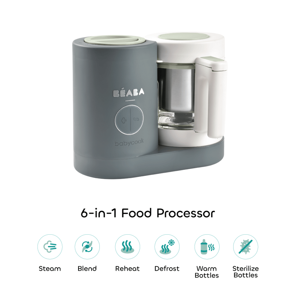 The Beaba Babycook Neo is a multifunctional 6-in-1 baby food maker that makes mealtime easy and hassle-free. Suitable from birth with bottle sterilization and warming features that evolves with your baby as they start solids. Steam, blend, and cook vegetables, fruits, dal, rice, khichdi, pasta, chicken, hummus, and much more with just one button. The soft steaming method helps preserves nutrients while the stainless steel blades allows you to blend easily to your desired consistency from smooth to chunky purees. The Babycook is designed with an auto shut-off functionality that avoids overcooking or the need to keep checking. It is a one pot baby food cooker that aids and simplifies your baby's feeding journey.  Comes with a silicone suction divided meal set and 2nd stage spoon. The suction plate is made to stick to the table to avoid mess. The ergonomically designed spoon comes with a long handle that ensures an easy grip for the baby.