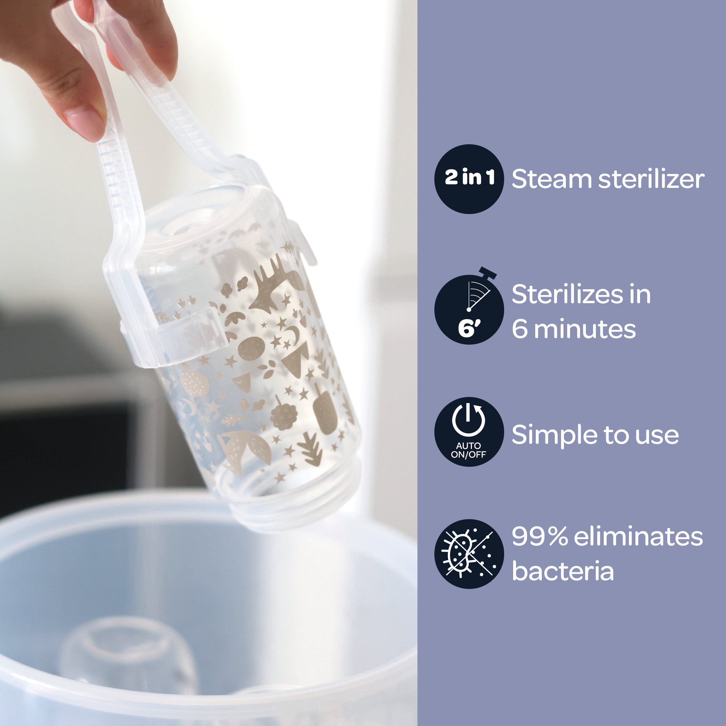 - Easy & Safe to Use - Designed with a single on/off button and automatic shut-off, making sterilization completely hands-free, safe, and convenient for parents.