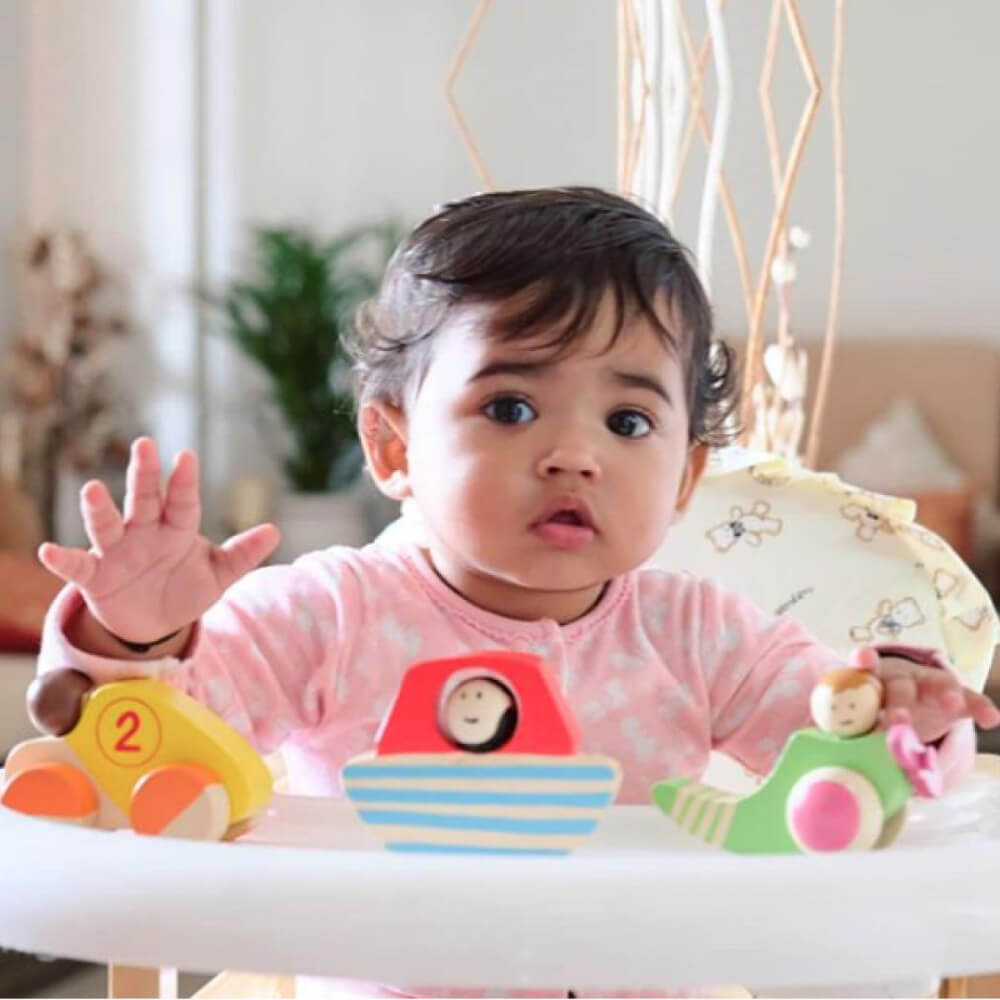 - Enjoy the seesaw motion of the cute boat, turn the propeller blades to soar with the helicopter, or watch the car zoom on its big chunky wheels.