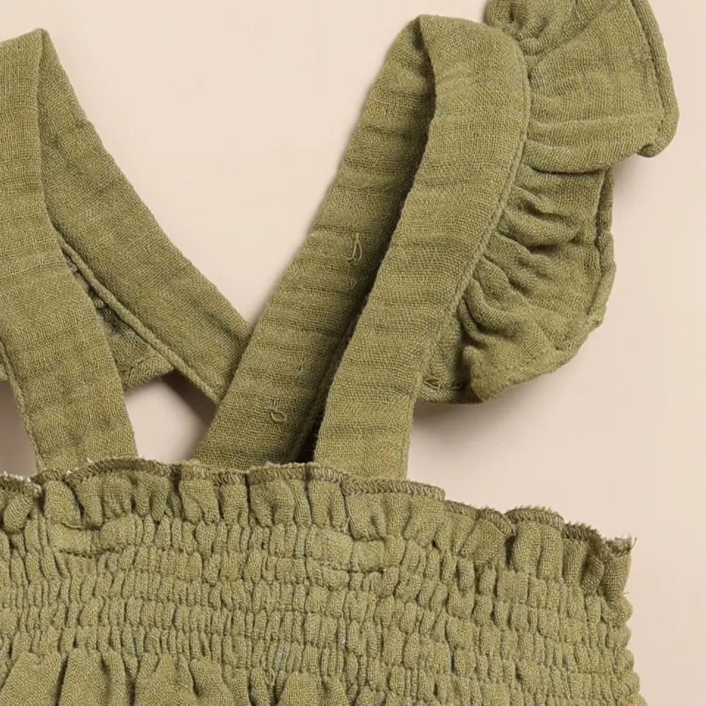 Keep your little one cool and adorable with the Cot & Candy Organic Muslin Sleeveless Frill Top, crafted from 100% GOTS Certified Organic Cotton Muslin. This ultra-light, breathable top is gentle on delicate skin—perfect for warm, sunny days. Featuring a smocked waistband for a snug yet comfy fit and ruffled cross-back straps for a charming touch, it’s designed for both style and movement. Free from harsh dyes and chemicals, it’s a safe, sustainable choice for your baby’s summer wardrobe.