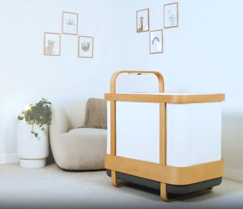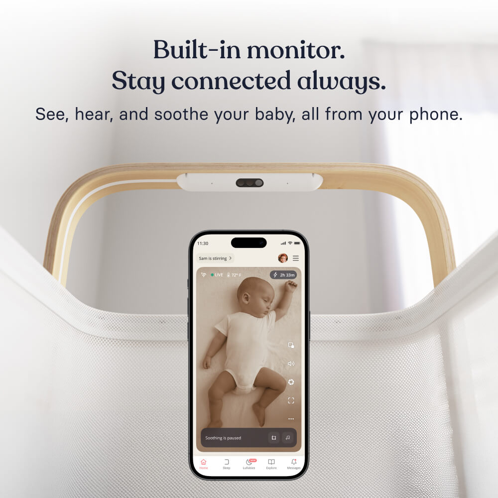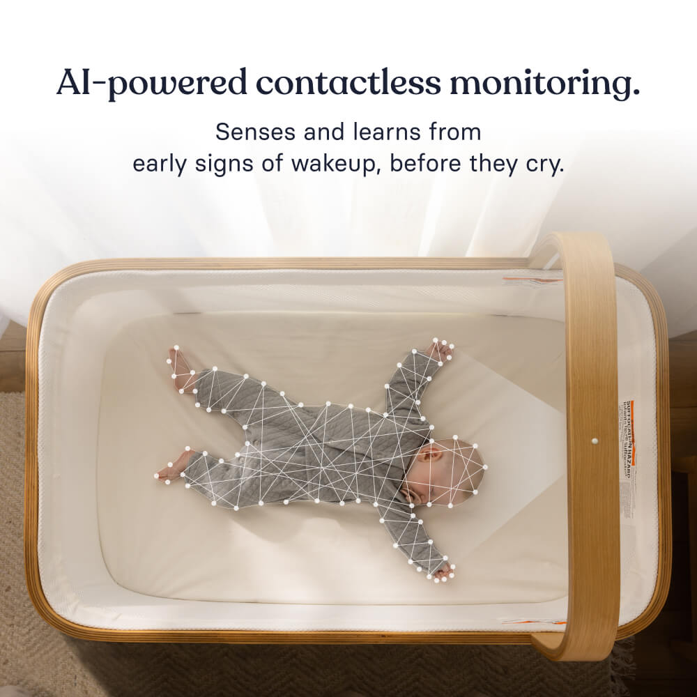 This beautifully crafted crib is more than just a place to sleep. It replaces multiple nursery essentials by combining a bassinet, crib, baby monitor, sound machine and sleep tracker into a single elegant unit.