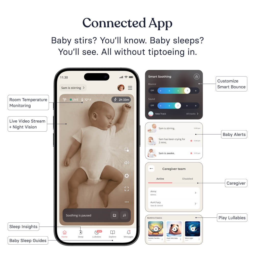 - App-connected: Stay connected through LIVE video/audio monitoring, adjust bounce settings, understand sleep patterns, add caregivers and get notified when your baby needs you