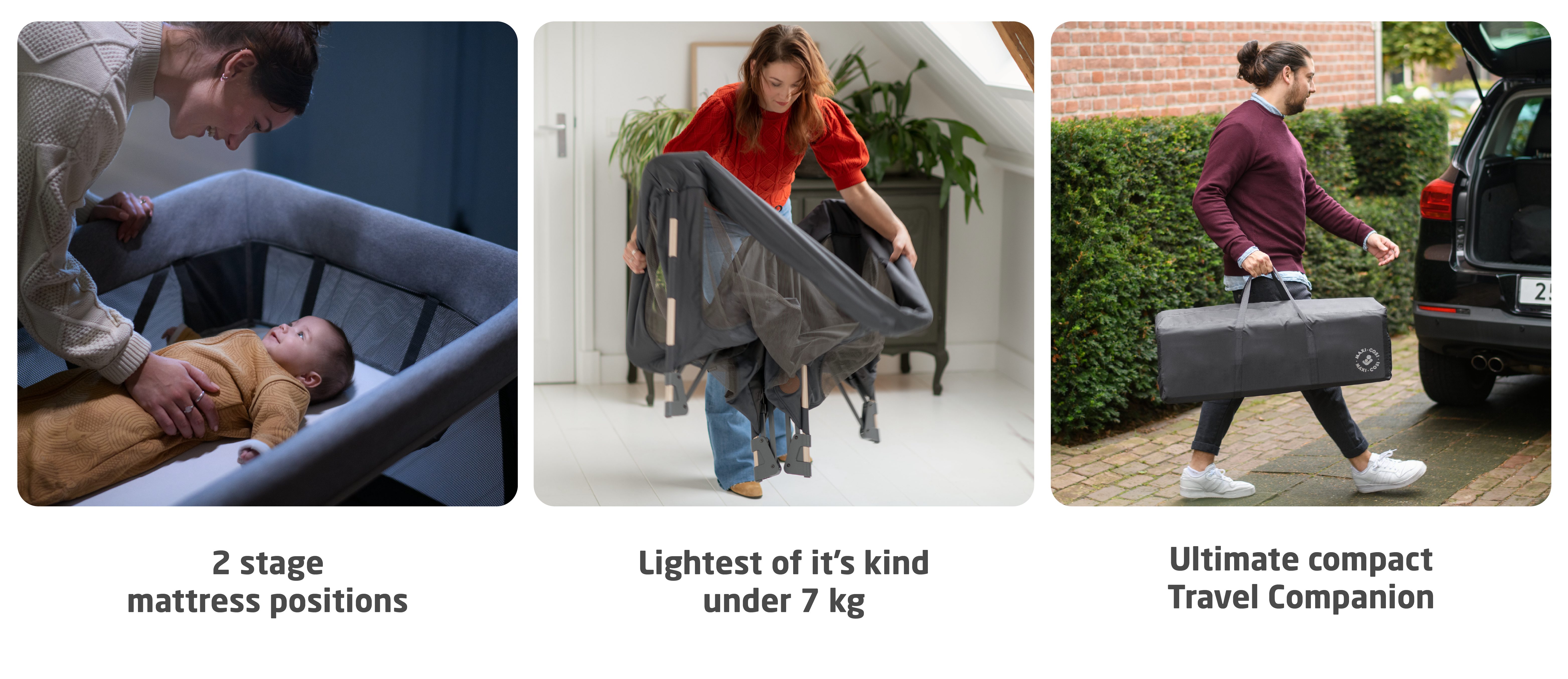 The Maxi-Cosi Swift is expertly designed to be used a new-born bassinet, a travel cot, and a sturdy playpen. The multifunctional 3-in-1 design is lightweight, portable, and effortlessly folds within seconds. It comes with a unique two-stage mattress which unzips to perfectly fit the bassinet, providing a smaller, cosier mattress ideal for new-borns. As your baby grows, the mattress zips back together to create a larger, super-comfy space for playtime or a well-deserved nap. At only 7 kg, the Maxi-Cosi travel cot is so light it almost floats. And with a lightning-fast, one-second fold, Maxi-Cosi Swift is easily the quickest travel cot you’ll ever put up, down and up again. Suitable from birth to 3.5 years, the Swift is ideal for traveling families, quick naps, and safe playtime at home or on-the-go. This versatile baby cot combines comfort, style, and convenience for busy parents.