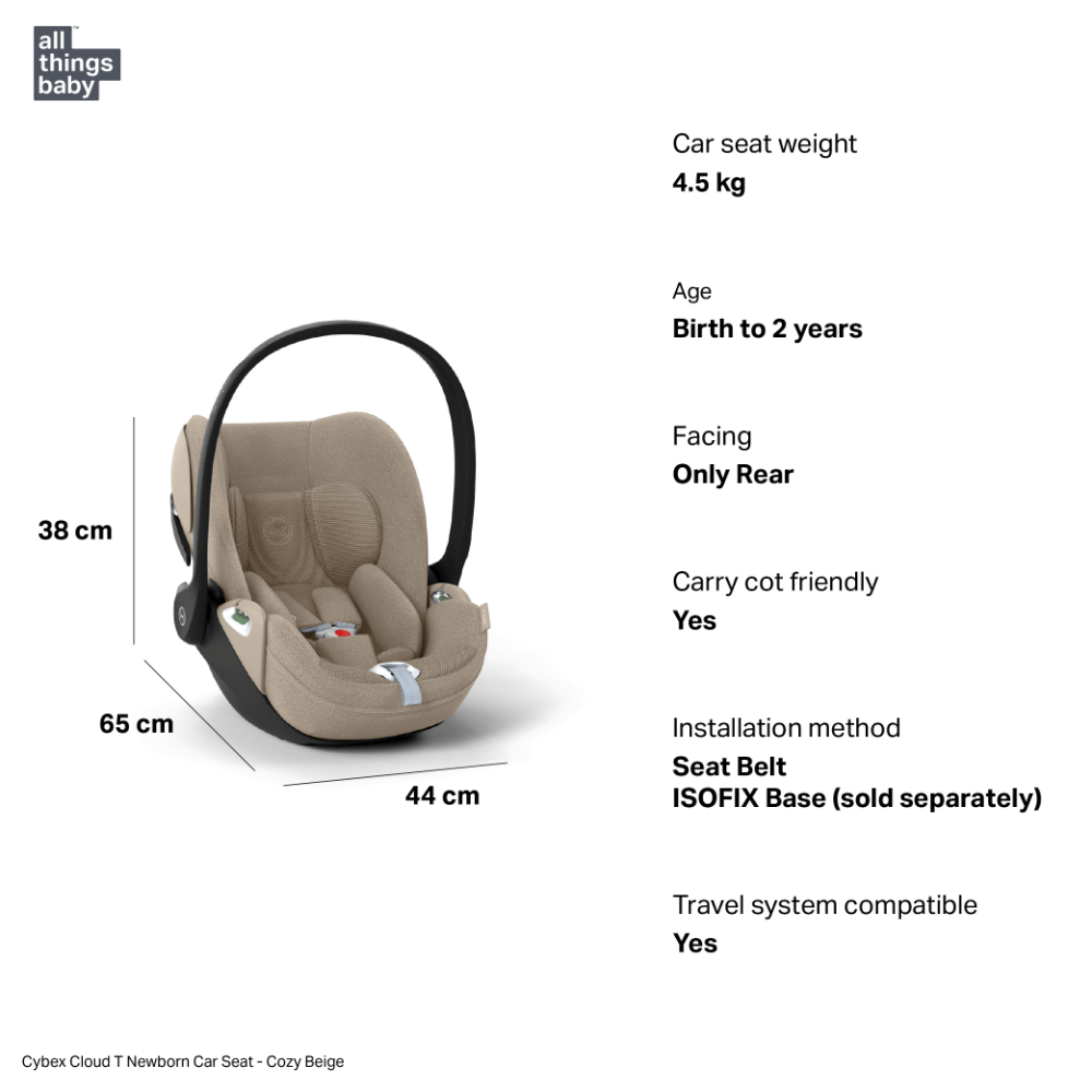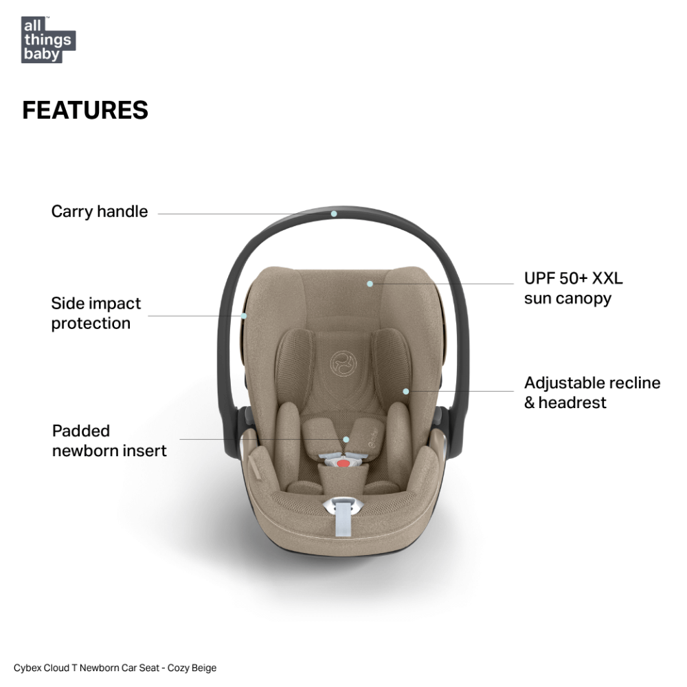 The Cybex Cloud T Infant Car Seat provides safety and comfort with 12 height-adjustable headrest positions and crash-test proven Linear Side Impact Protection system. It includes a newborn inlay, all-around ventilation system, and comfortable in-car recline and a lie-flat position when used as a travel system to add up to the perfect infant/newborn car seat from birth to 2 years.
