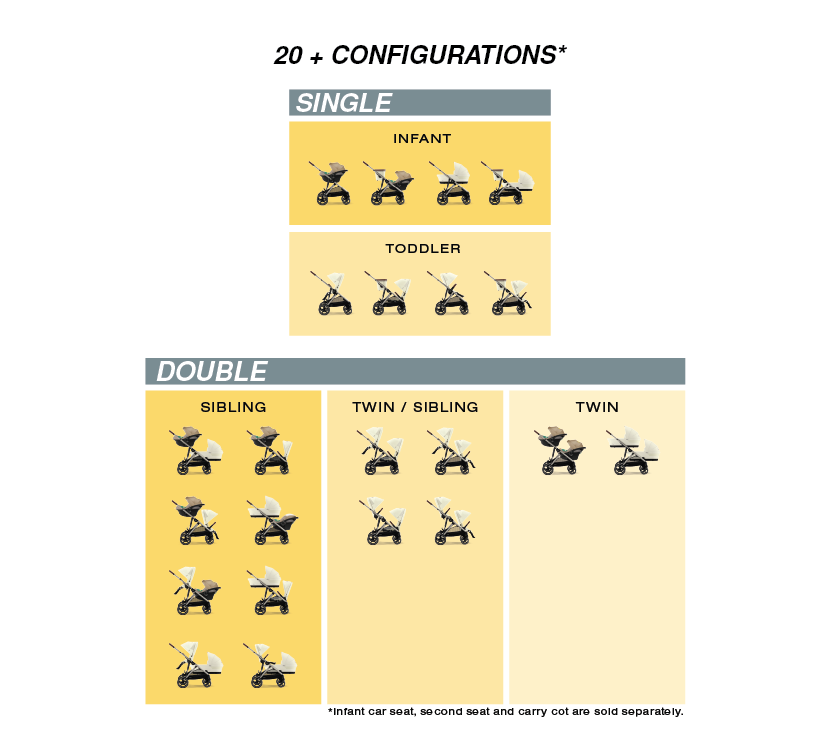 - Over 20+ seat configurations and converts to a twin stroller (additional seat pack sold separately)