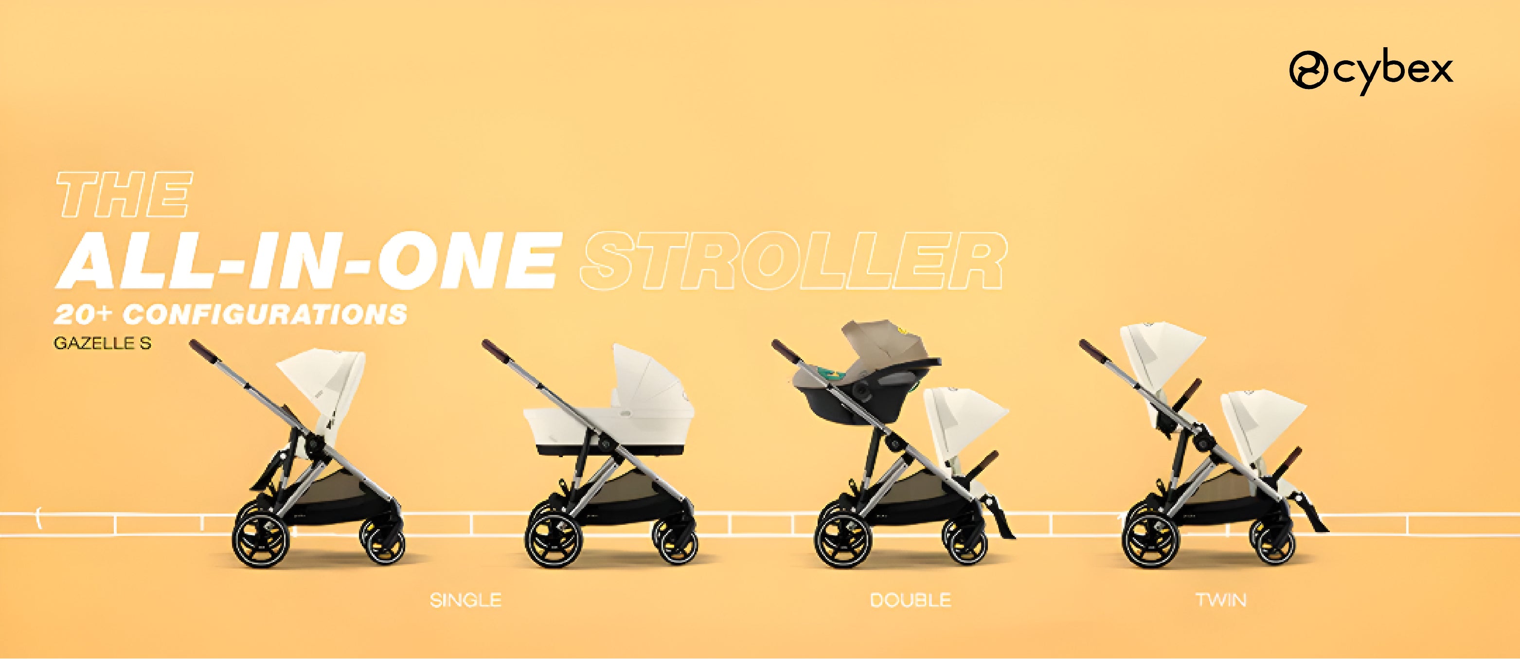 The Cybex Gazelle stroller is designed with a reversible seat that easily switches from rear to forward facing. The ergonomic flat seat recline makes the stroller ideal for newborns from birth to 4 years. With an adjustable backrest, legrest, and seat height positions, the Gazelle can be configured into a twin stroller.