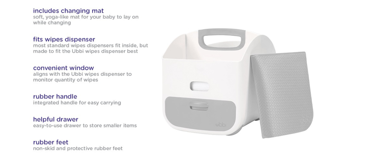 The Ubbi Diaper Storage Caddy and Changing Mat provides parents with convenience, durability and accessibility by having all the diapering supplies organized in one portable storing unit. Made of sturdy plastic, the Ubbi diaper caddy has two main compartments for diapers and wipes, with a drawer for smaller items and a fitted space that includes a comfortable and easy-to-clean changing mat. The caddy also has an integrated handle and non-skid rubber feet allowing it to be carried around or stay safely in one place.