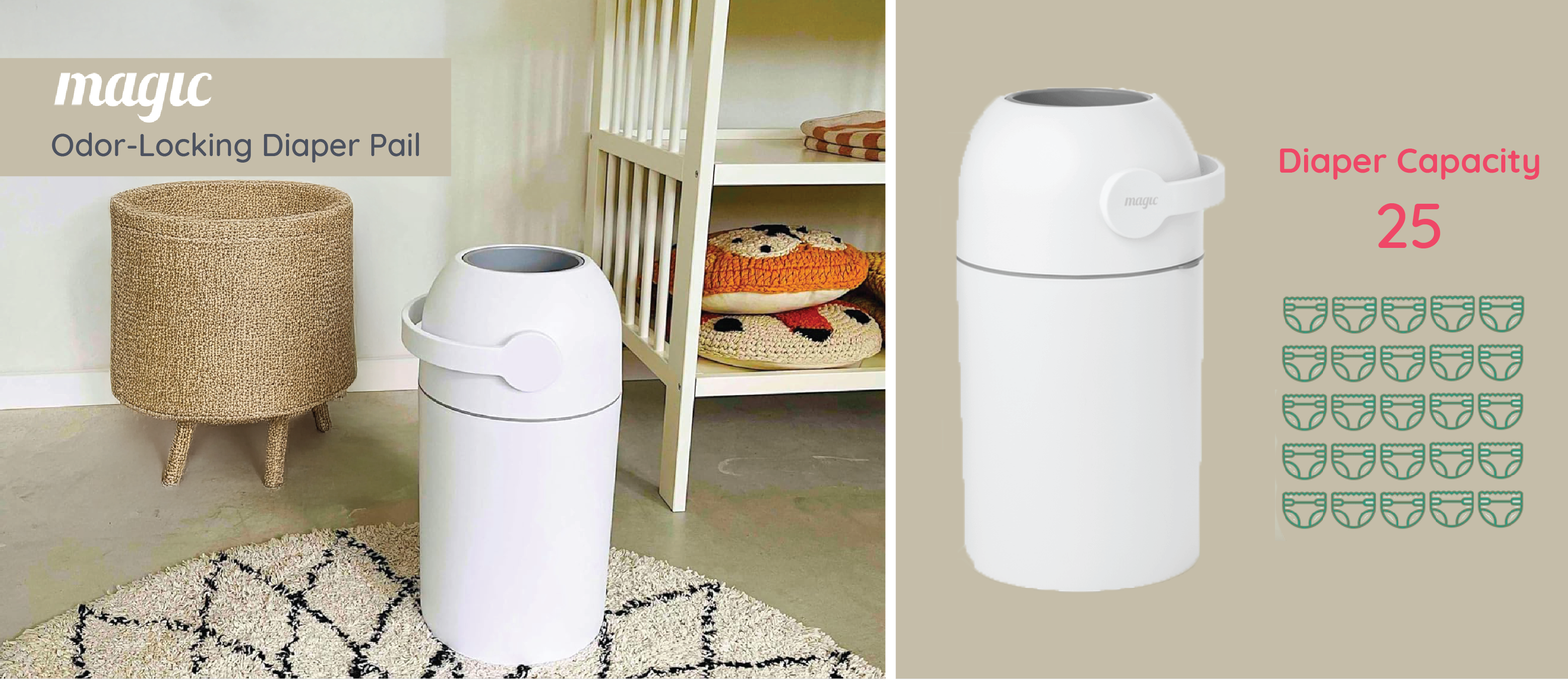 Make diaper changes an easy, odorless breeze with the Magic Majestic diaper pail. Equipped with an odor-locking lid and seal to keep your room smelling nice, fresh, and pleasant. It is practical and easy to use with one hand to lock odors inside the pail. The Majestic diaper pail is designed to be used with any standard trash bag, making this diaper pail cost-effective and hassle-free with a capacity of 25 newborn diapers. A compact diapering solution that fits into any room or nursery to ensure maximum odor control