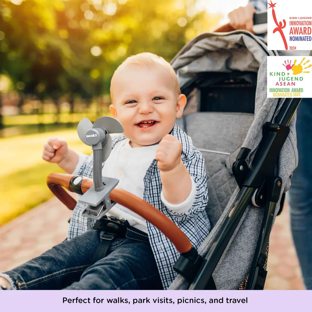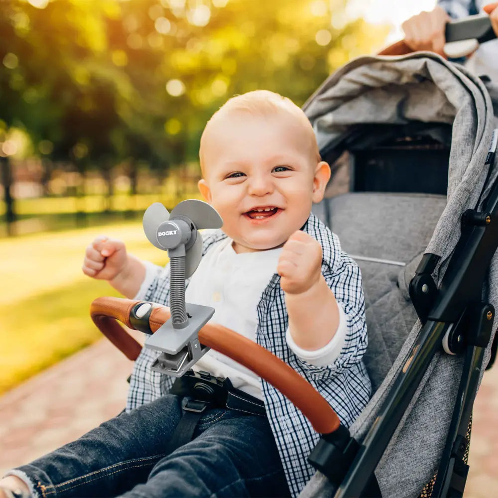 The Dooky Universal Stroller Fan keeps your baby cool and comfortable on hot days. The fan has harmless, baby-safe soft foam fins. The Fan has a flexible neck that allows you to position the fan in any direction. The spring-loaded clip houses the battery pack (2 x AA batteries required) that powers the fan. The clip can easily be attached to any stroller bar, cot rails, and playpen. (2x AA batteries not included).