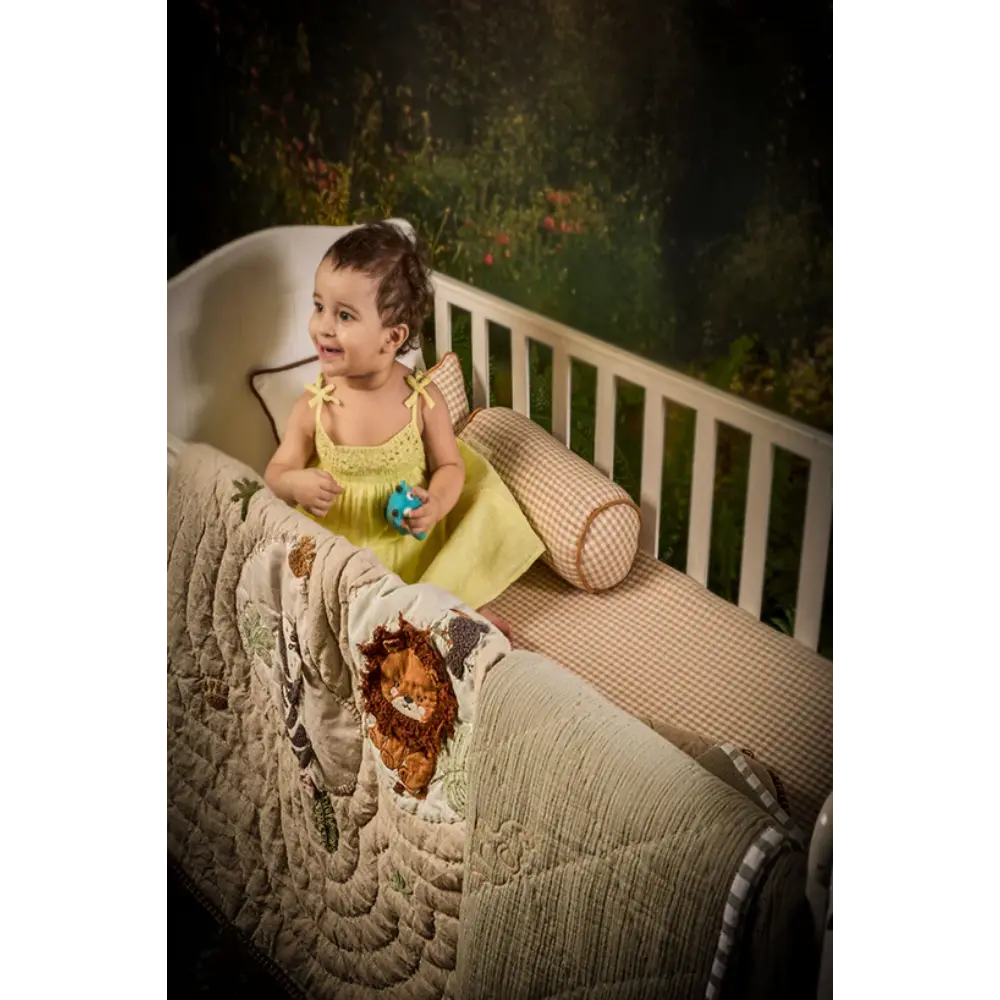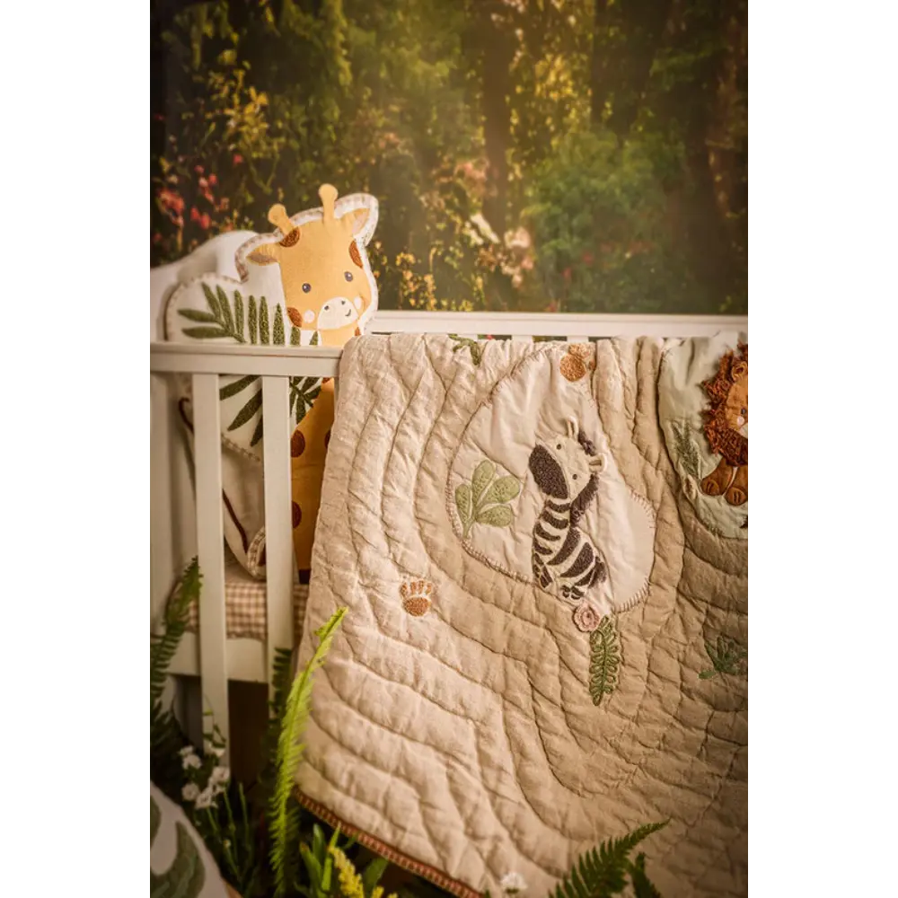 Finished with hand-quilting for a soft hand feel, a checkered quilted back, and blanket stitching around the edges, this piece is as durable as it is delightful. Lightweight yet cozy, the Jungle Safari bedding doubles beautifully as a bedspread or a charming statement piece for any nursery or kids’ room.