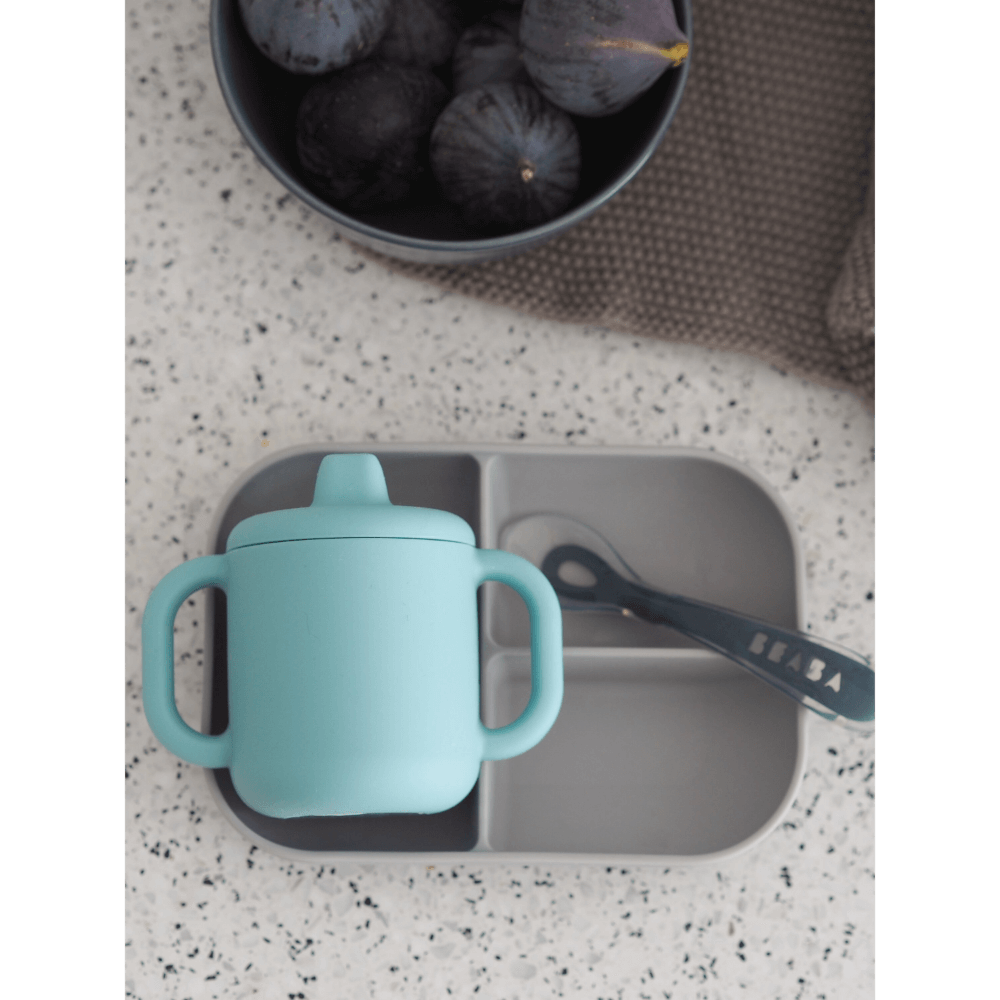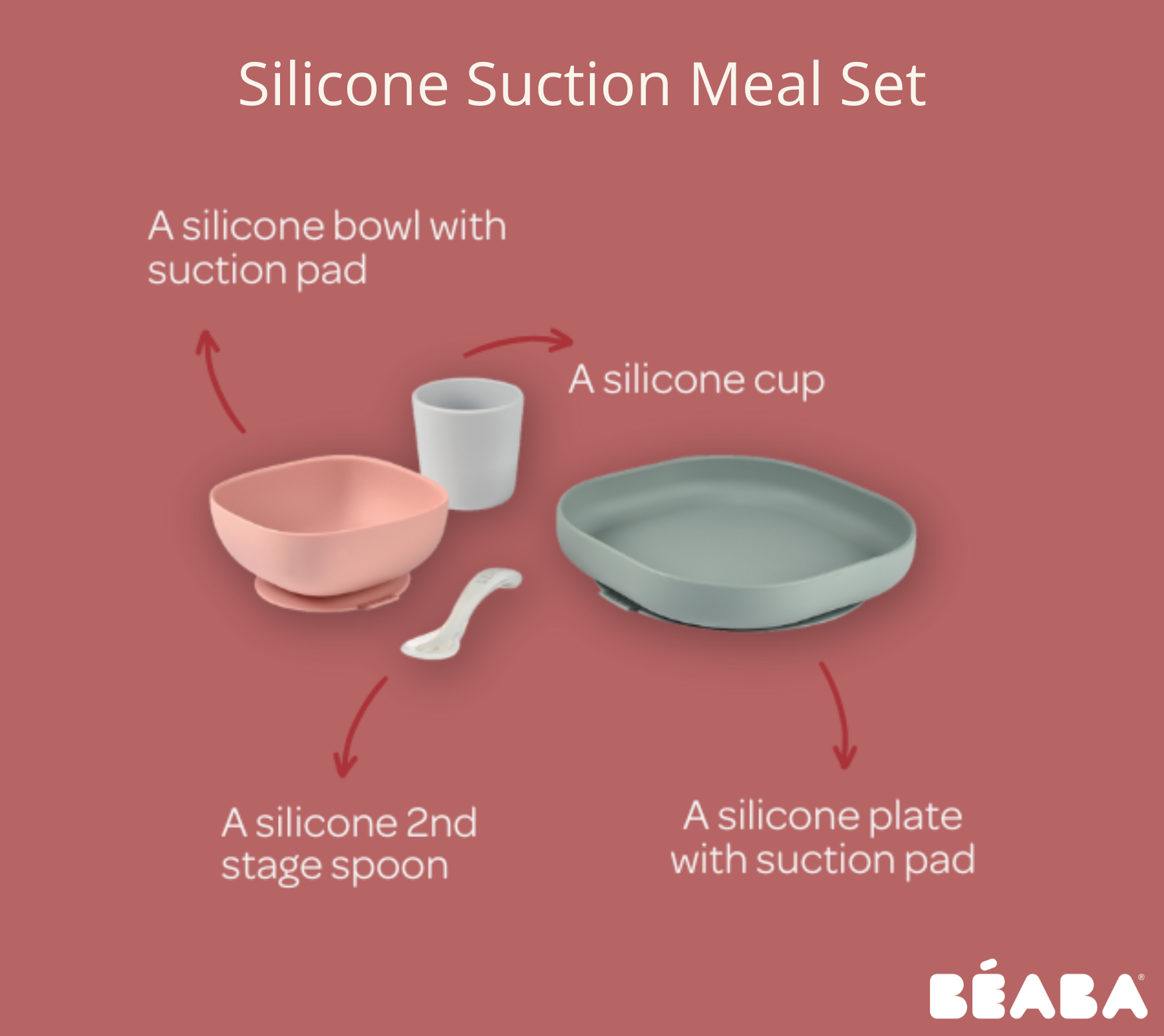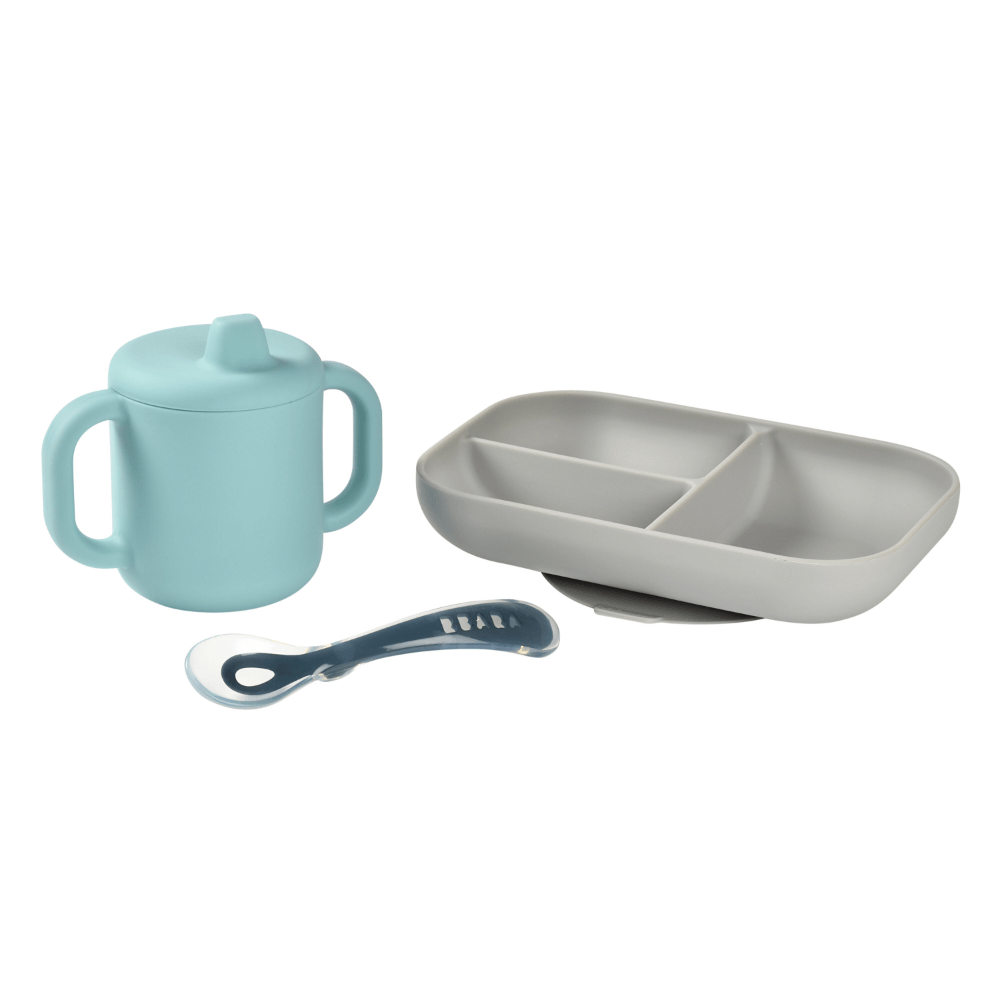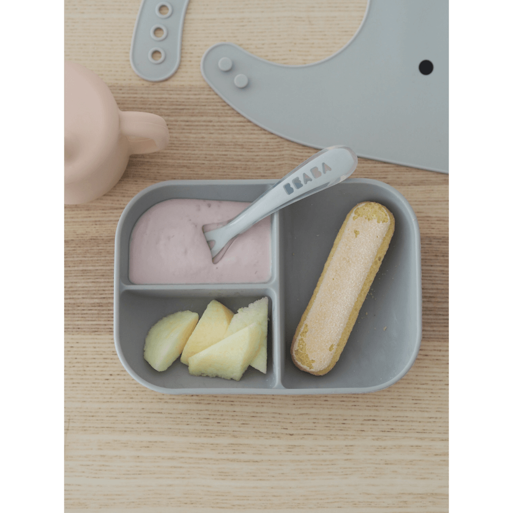 - Complete First Meals Set: The Beaba Silicone Learning Set includes a divided suction plate, a 2nd stage silicone spoon, and a silicone learning cup with a spout lid. Designed to help babies and toddlers transition easily to self-feeding