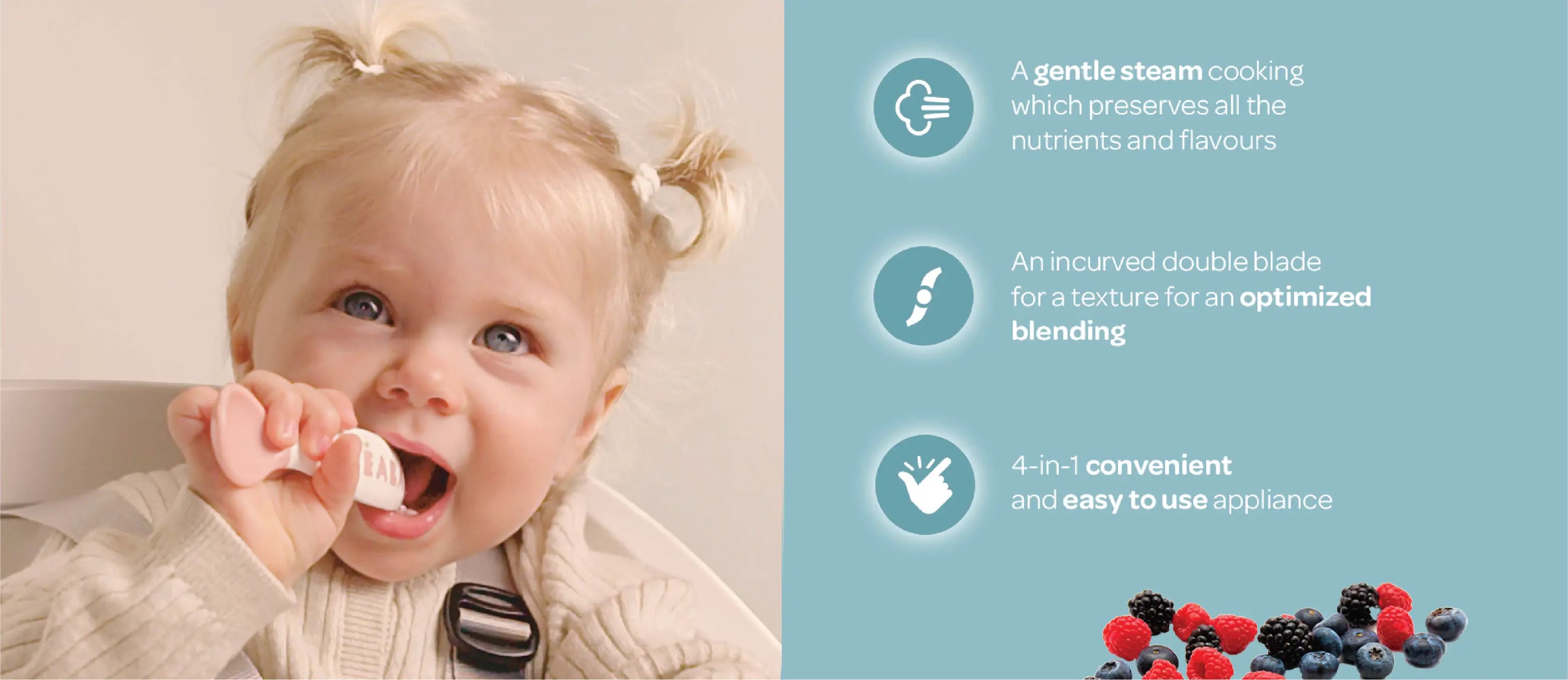 - Even cooking: Double curved blade for various textures (smooth, ground, chopped) and adapted to the child's age. Patented mixing paddle and Express cooking mode for even and fast cooking!