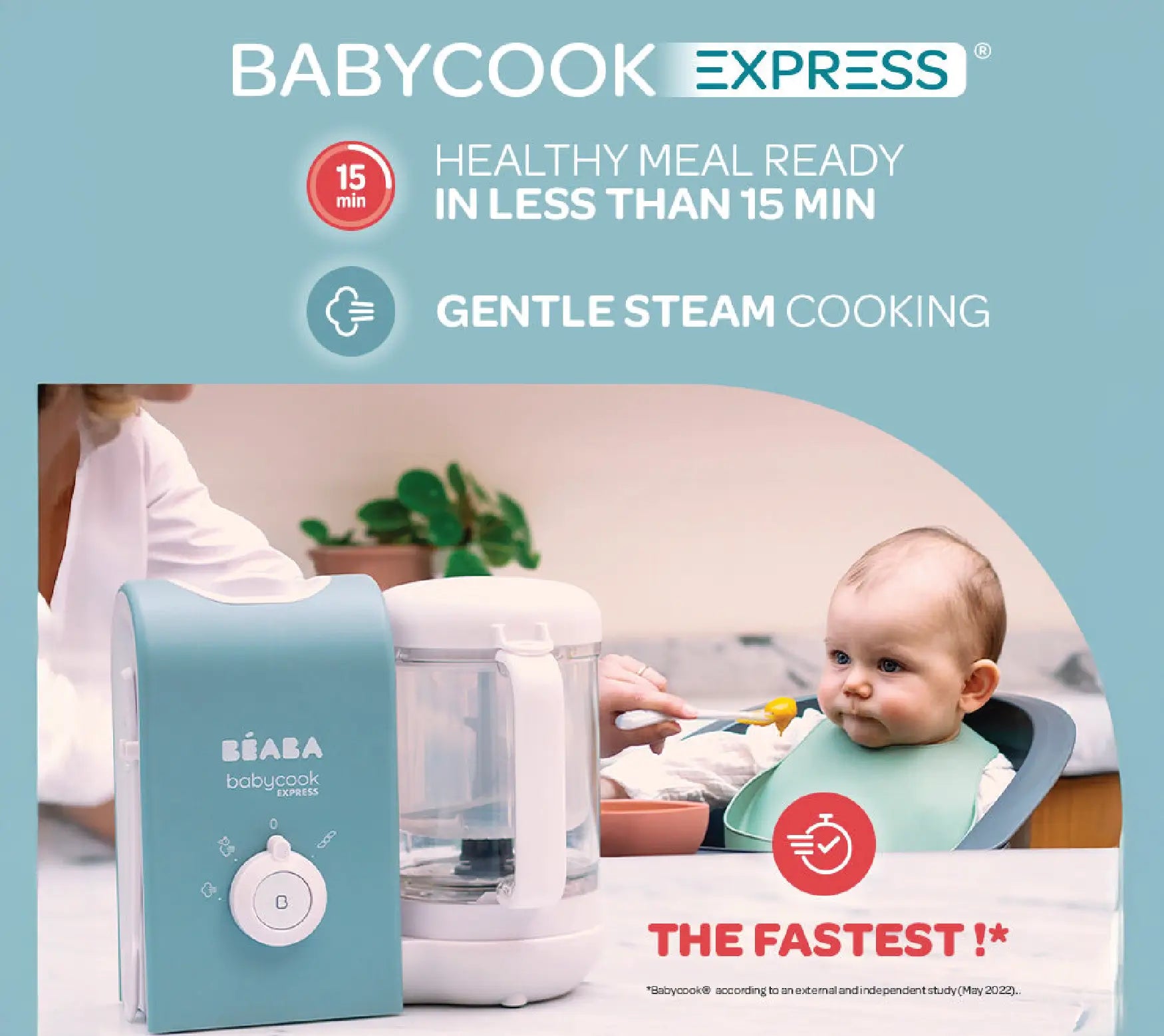 The Babycook Express is a multifunctional product designed to simplify the preparation of your baby's meals. It offers two cooking modes: an Express mode for time-saving and an Eco mode for gentle, more environmentally friendly cooking. The gentle steaming and cooking modulation in both modes help preserve the nutritional benefits of the food, as well as its taste qualities. Suitable from birth with bottle sterilization and warming features that evolves with your baby as they start solids. Steam, blend, and cook vegetables, fruits, dal, rice, khichdi, pasta, chicken, hummus, and much more with just one button. The stainless steel blades allows you to blend easily to your desired consistency from smooth to chunky purees. The Babycook is designed with an auto shut-off functionality that avoids overcooking. It is a one pot baby food cooker that aids and simplifies your baby's feeding journey.