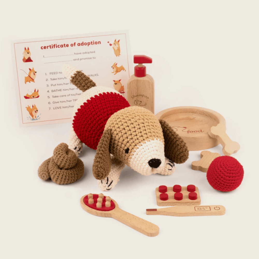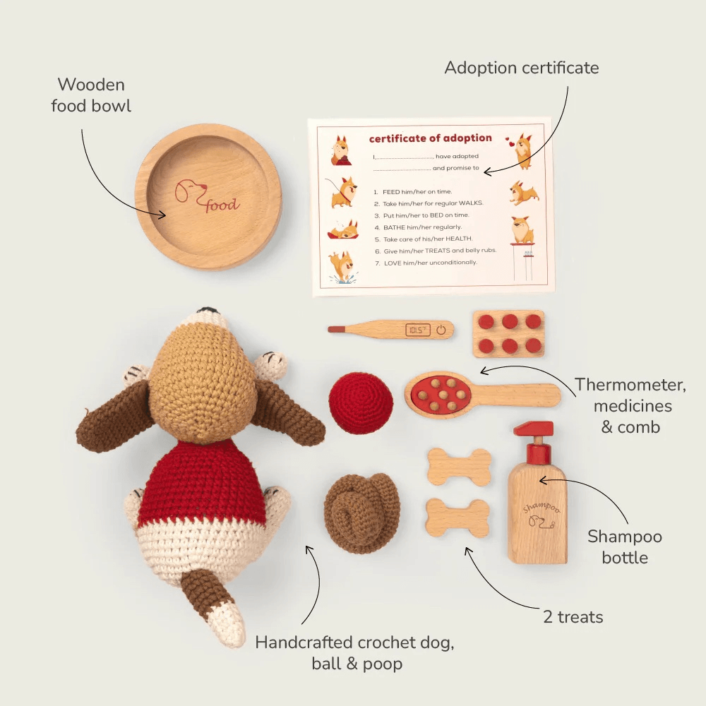 Handcrafted crochet dog, ball, and poop, Wooden food bowl, thermometer, shampoo bottle, comb, medicines, and 2 treats