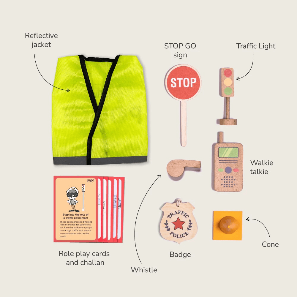 Adoption certificate ,Cotton storage bag, Handmade picnic basket, Wooden plates, cutlery (set of 3), juice box, and 12 food items, Picnic mat, Reflective Jacket, Stop Go Sign, Traffic Light, Whistle, Walkie Talkie, Cone Badge, Role play cards including challan