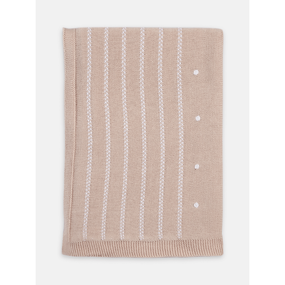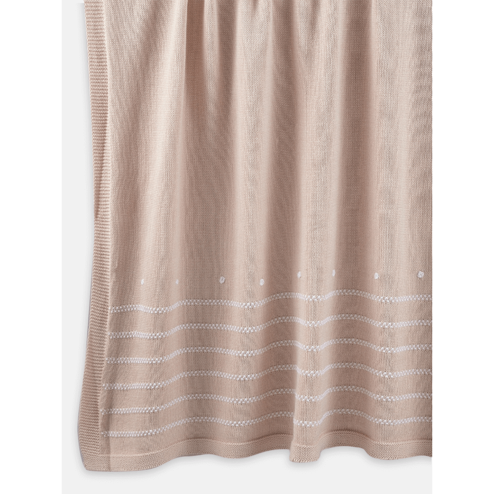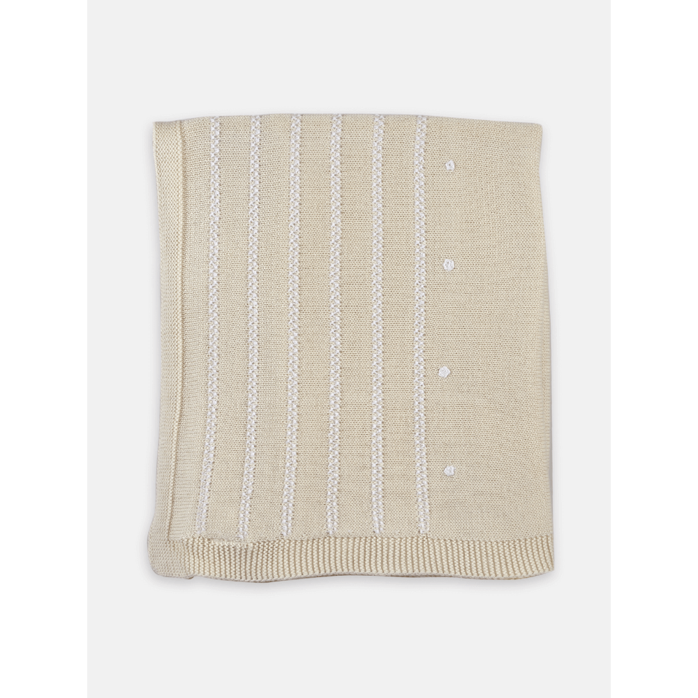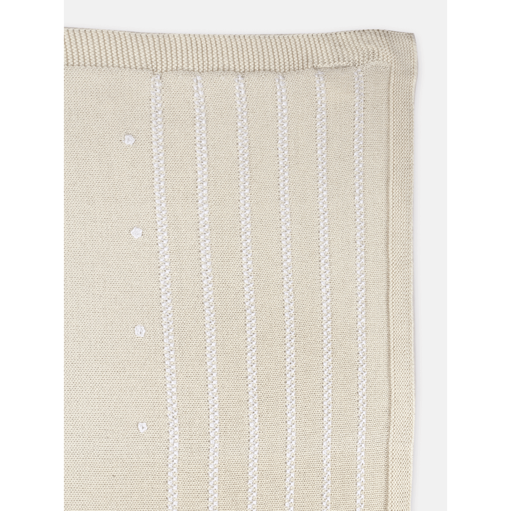 This chic and luxurious knitted blanket with vertical embroidered stripes is a beautiful and practical gift for a baby.
