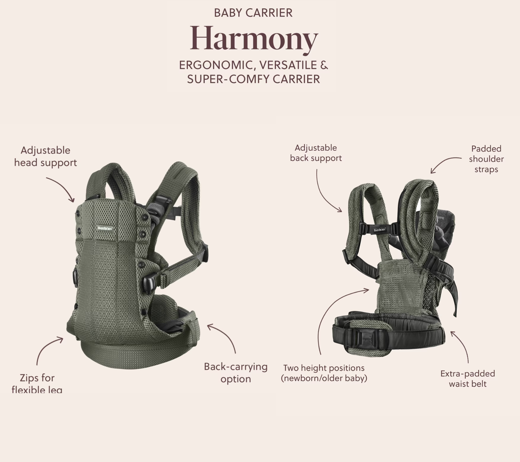 - 4 Carrying Positions: Newborn, facing-in, facing-out (5+ months), and back carry (12+ months)