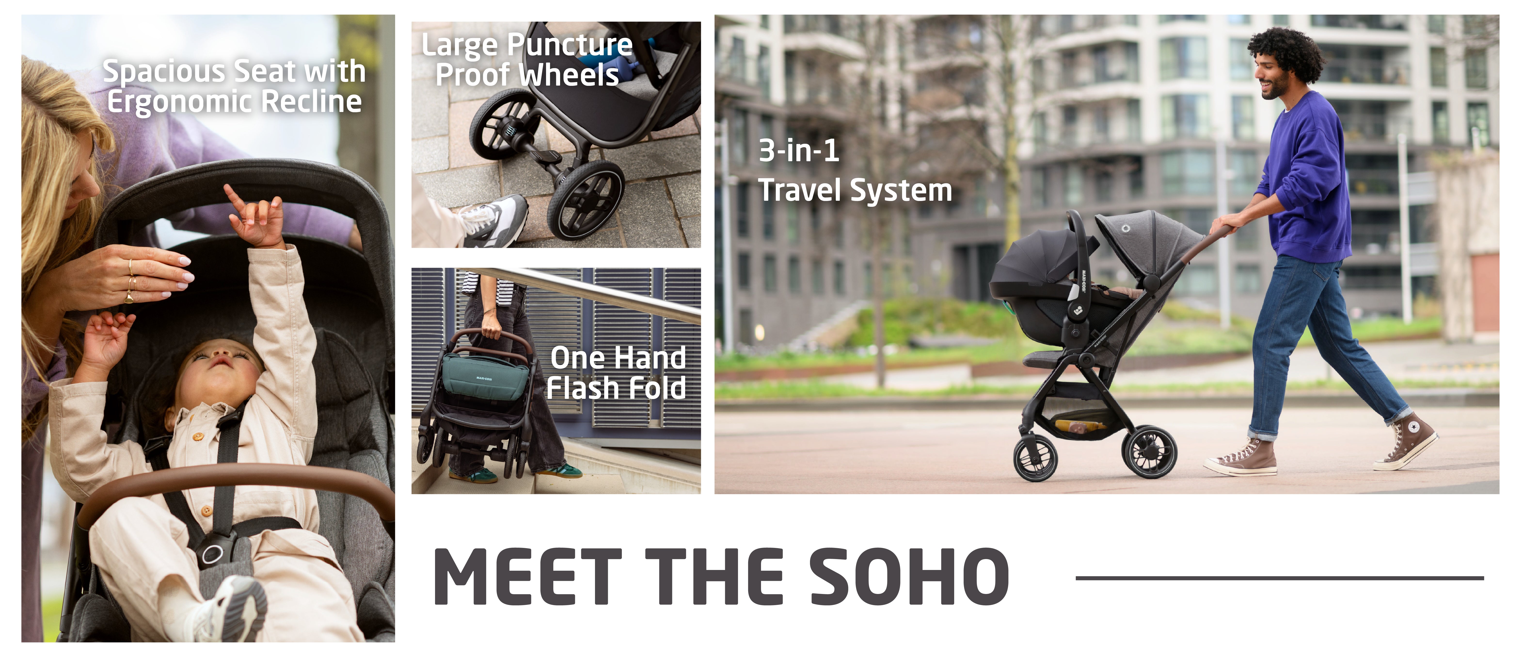 The Maxi-Cosi Soho is an ultra-compact stroller that is expertly designed for safety, comfort, and functionality. With an automatic one-hand fold, ergonomic near-flat recline for new-borns and a spacious soft padded seat for toddlers up to 4 years old, your little one will be comfortable and secure at every stage. The stroller features three different recline positions for nap time and an extra ventilation window for optimal comfort. The Soho has puncture-proof wheels and suspension to ensure comfort on every ride. The 5-point safety harness, 360-degree movable bumper bar, storage basket, and a parent storage pocket, the Soho is suitable from birth to 4 years. Simply Flash-Fold and Go with Soho - making everyday adventures a breeze!