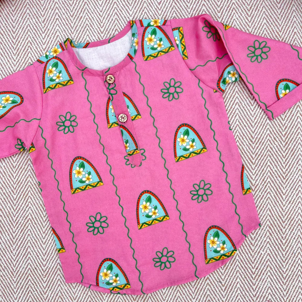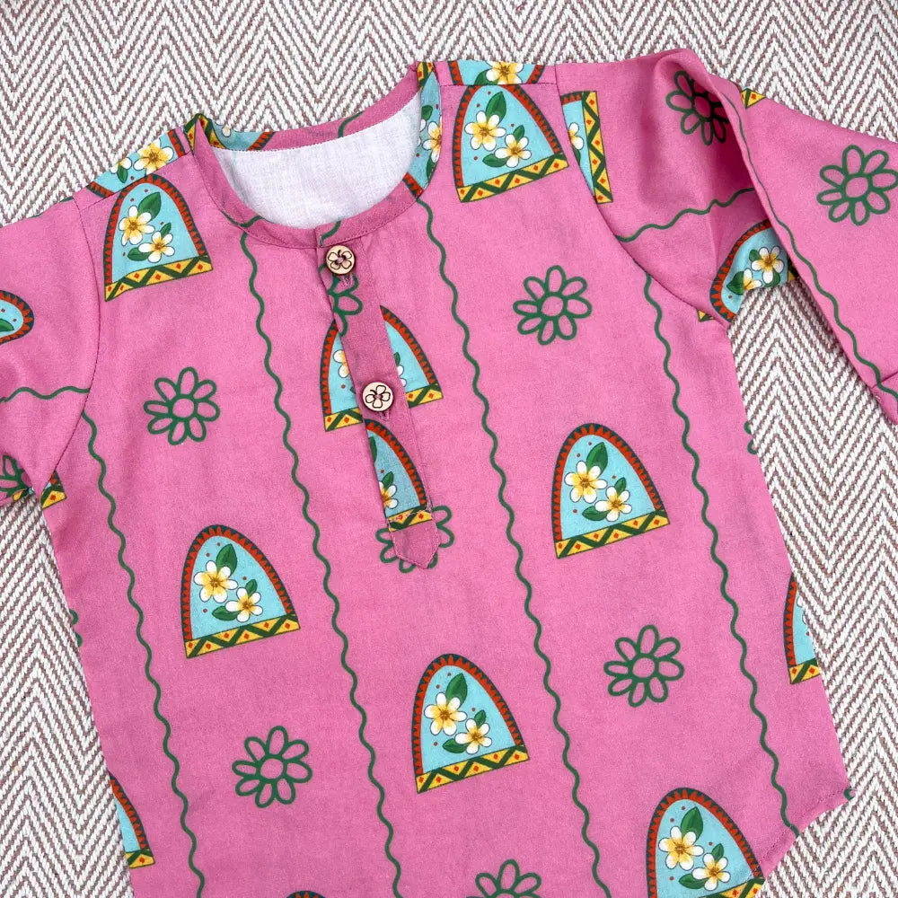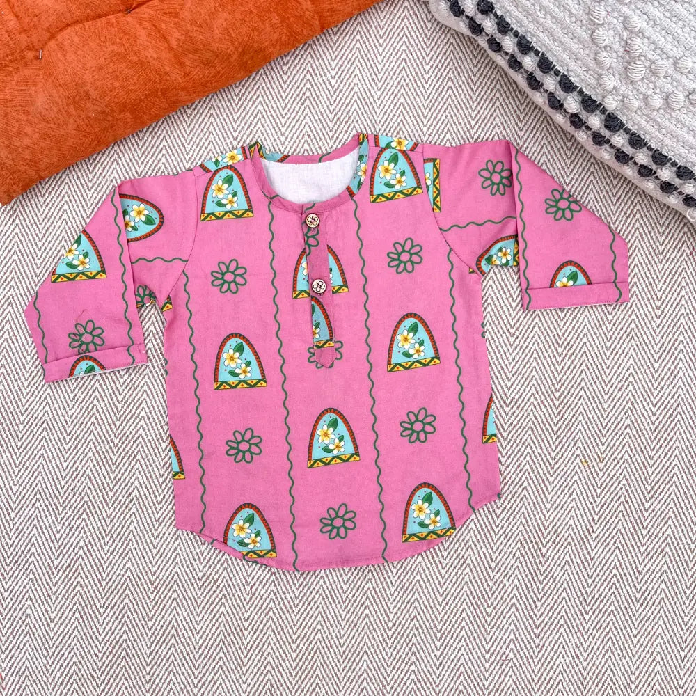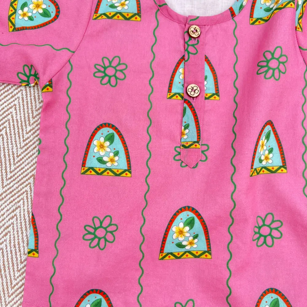 This kurta set is inspired by the sweet memories of summer days spent at Nani’s house. Covered in pretty Champa flower prints, it brings a touch of freshness and warmth to your little one’s look. Made from soft, breathable cotton, it’s gentle on the skin and perfect for all-day wear — whether for a family get-together, a festive celebration, or just a cozy day at home.