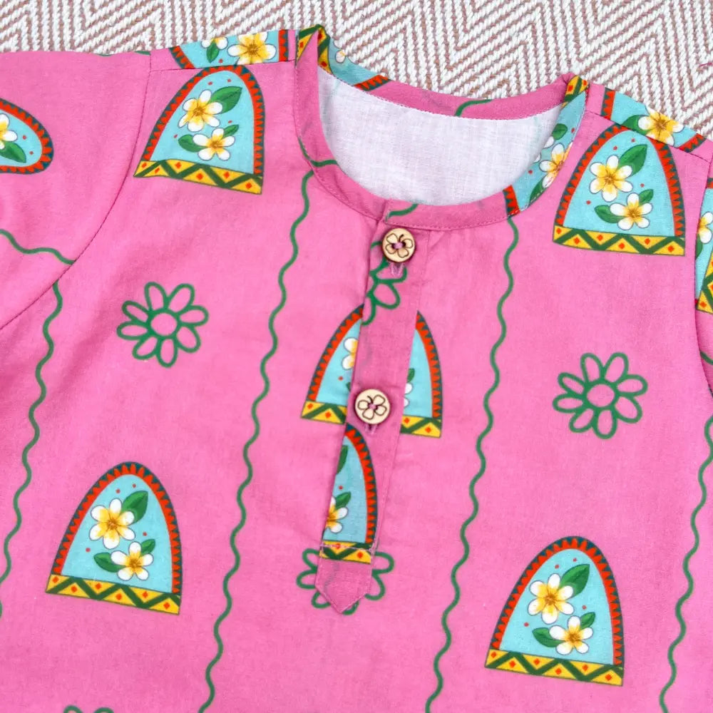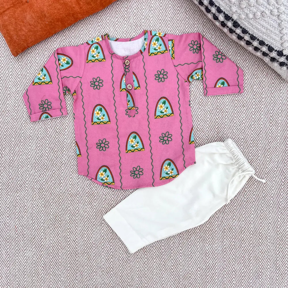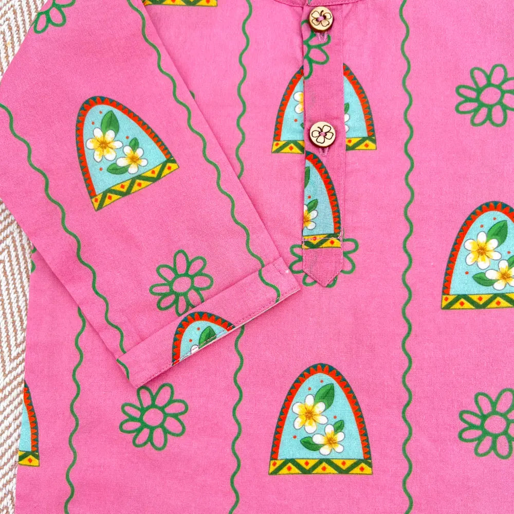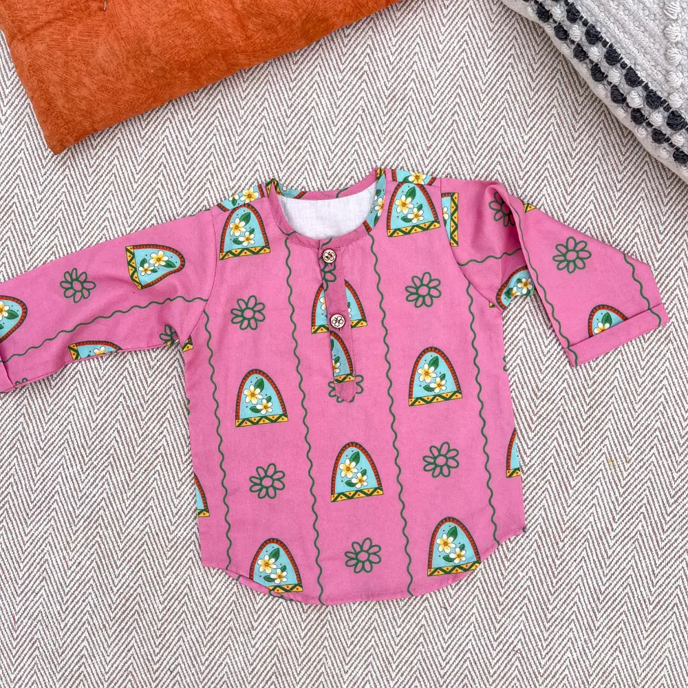 This kurta set is inspired by the sweet memories of summer days spent at Nani’s house. Covered in pretty Champa flower prints, it brings a touch of freshness and warmth to your little one’s look. Made from soft, breathable cotton, it’s gentle on the skin and perfect for all-day wear — whether for a family get-together, a festive celebration, or just a cozy day at home.