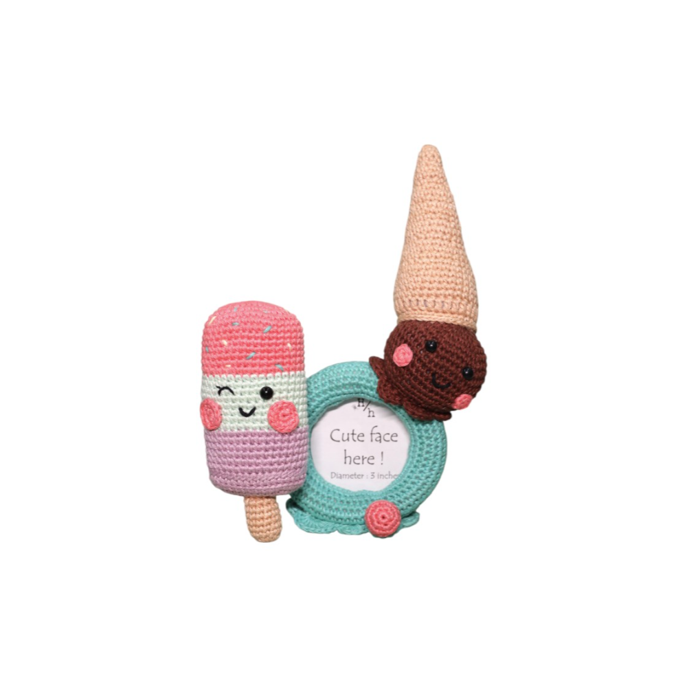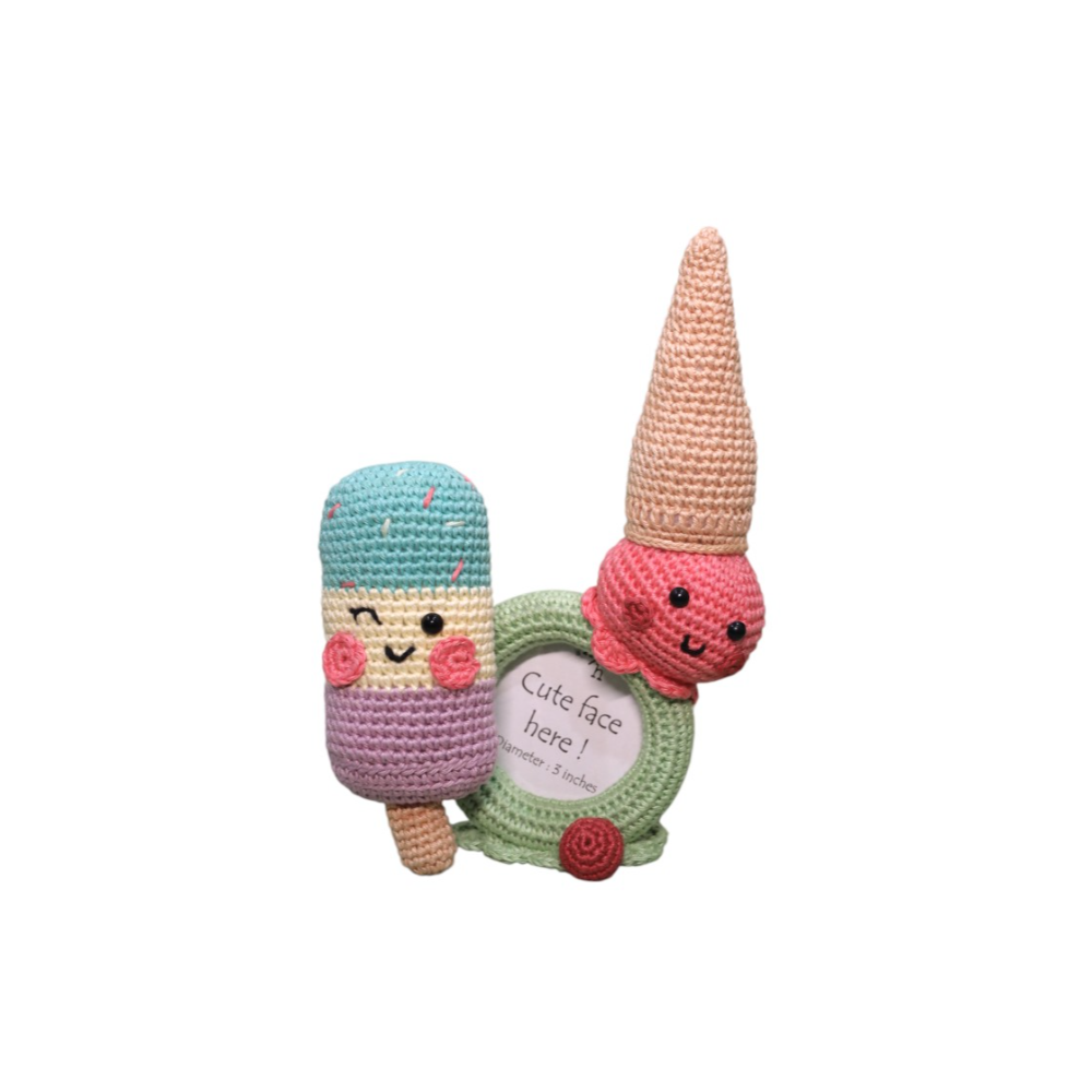 Featuring two adorable frozen treats—a pastel popsicle and a happy flavoured ice cream cone—this handcrafted frame is a playful way to showcase your little one’s sweetest smiles. Designed to hold a 3-inch photo, it's the perfect blend of charm and nostalgia. Smiling crochet treats bring a fun and playful vibe to any room. Ideal for babies, toddlers, or any cherished memory. Makes a thoughtful present for baby showers, birthdays, or summer-themed celebrations. Treat someone you love—or yourself—to this irresistibly cute keepsake!