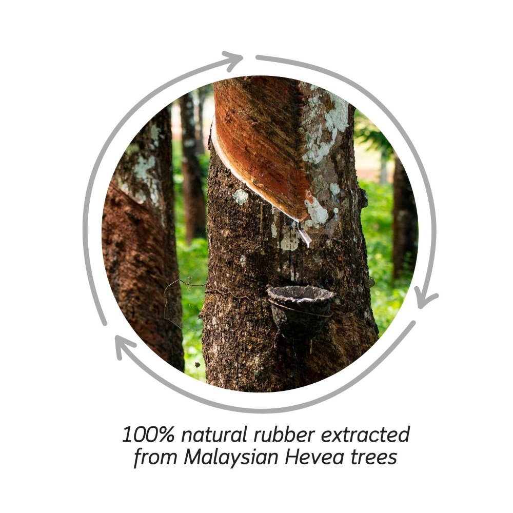 - Made with 100% natural rubber from Hevea trees.