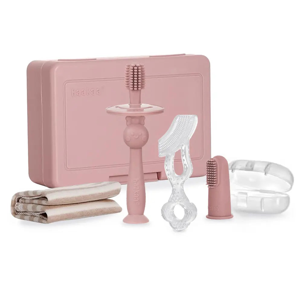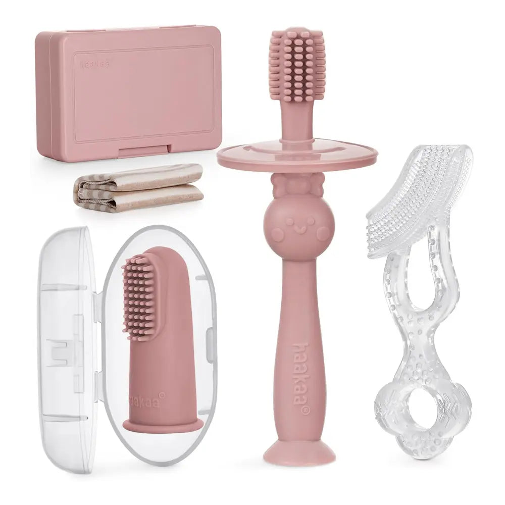 Clean brushes after each use. Although dishwasher safe, we recommend handwashing these products in warm, soapy water and rinsing and drying thoroughly. We recommend using the Haakaa Dish Soap. To sterilise, use a steam steriliser or boil in water for 2-3 minutes. Do not use bleach-based agents to clean these products. We recommend replacing your child's toothbrush every 3-4 months. Machine wash the cotton flannel in cold water. Tumble dry low. Do not bleach or iron. To clean the storage case, hand wash with warm water and rinse and dry thoroughly.