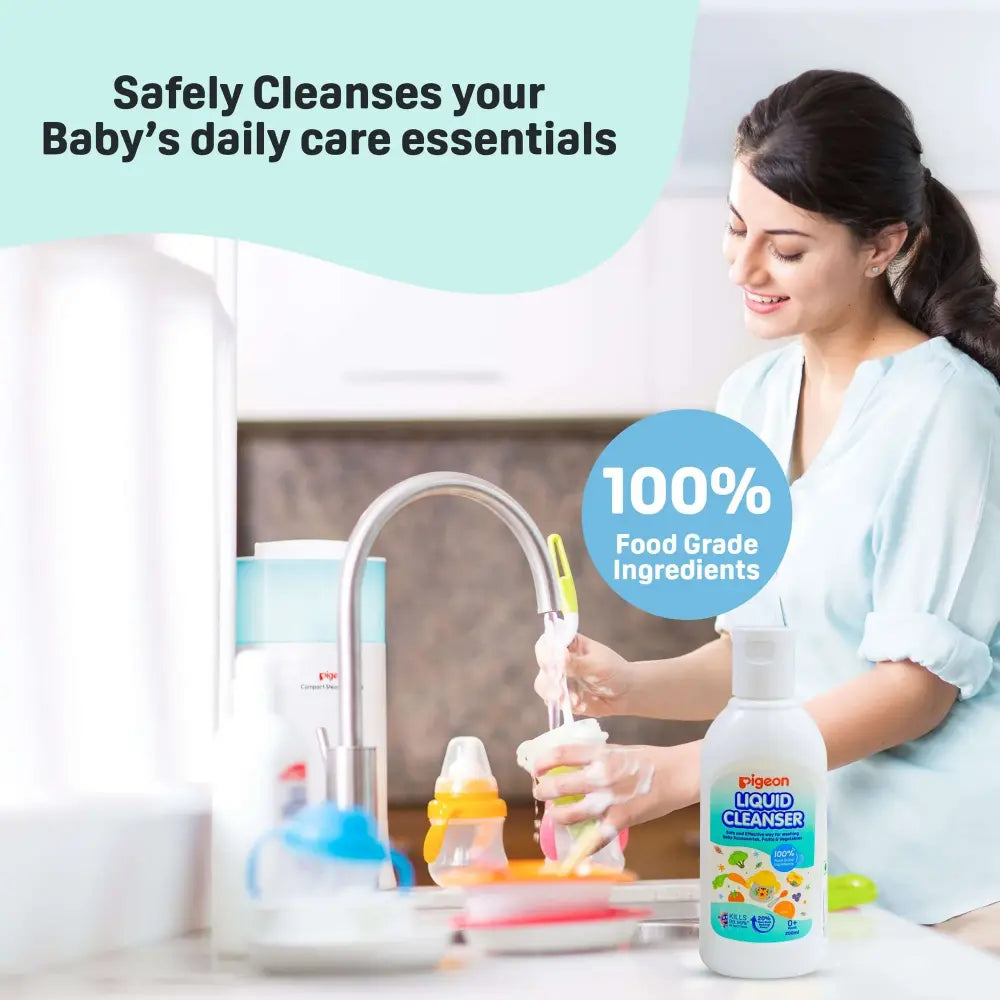Pigeon Liquid Cleanser For Nursing Products effectively removes tough milk stains and offers versatile, skin-friendly cleaning with antibacterial protection, made from 100% food-grade ingredients, and an easy rinse formula for convenience.