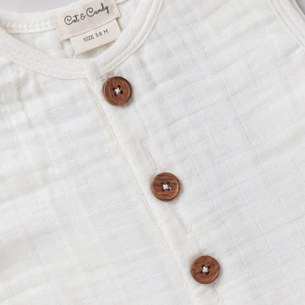 Discover Cot & Candy’s new range of muslin Half romper, crafted from 100% GOTS-certified organic cotton. Each piece is incredibly soft, lightweight, breathable, and pre-washed for superior hygiene—perfect for your baby’s delicate skin. These bodysuits are easy to care for and machine washable on a gentle cycle.