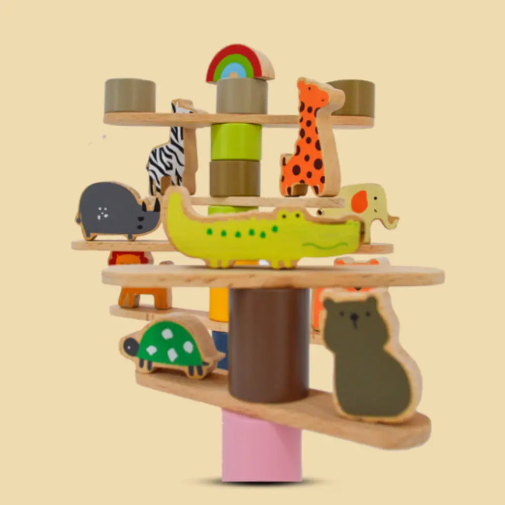 - Includes forest stacker wooden puzzle set with 10 individual animals, 6 sticks and 10 Balancing Blocks.