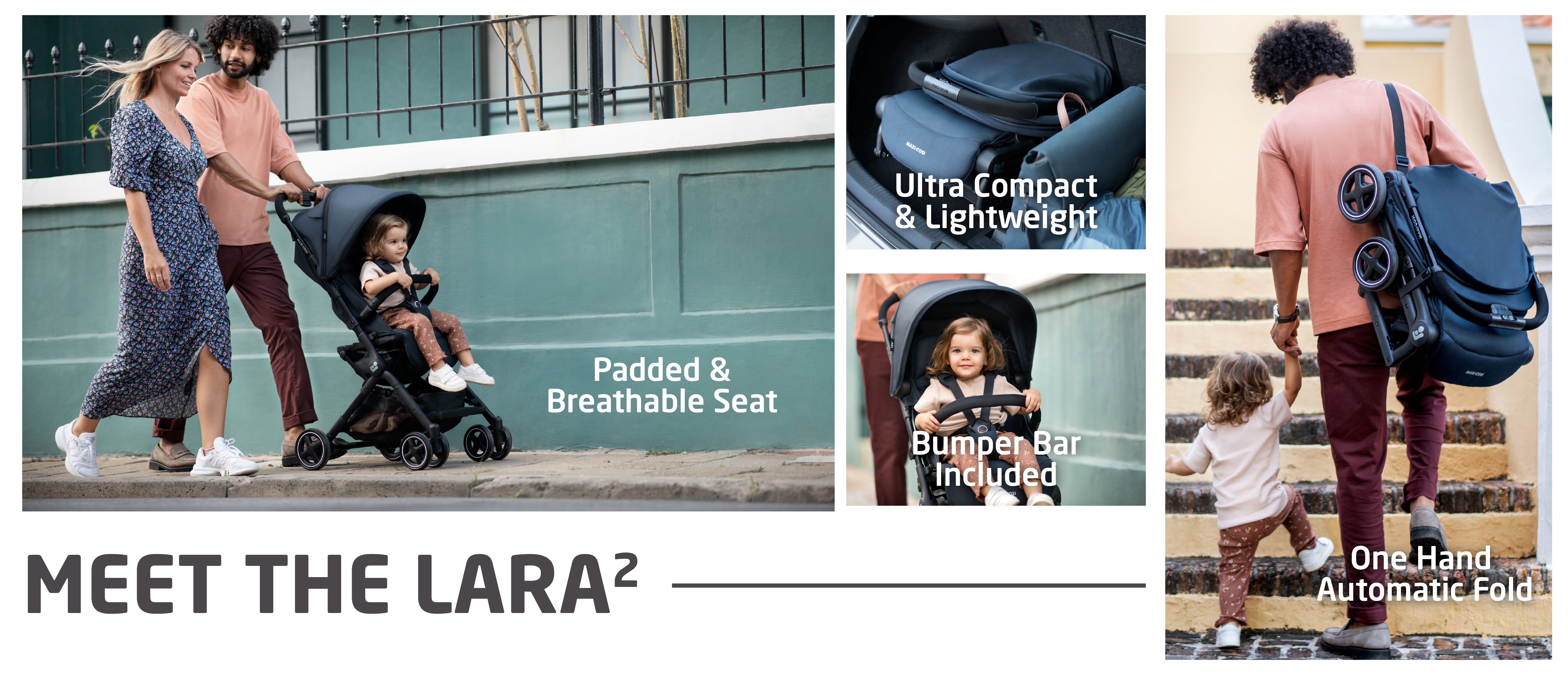 The Maxi-Cosi Lara² is the best ready-to-travel stroller from birth up to 4 years. It has a lightweight design, ultra-compact frame, and an easy one-hand fold feature. Weighing only 6.4 kgs, it is a cabin-friendly travel stroller* and can easily be carried with the integrated shoulder strap. Specially designed for your convenience by taking it wherever you go. The 2 storage pockets allows you to carry all your essentials. The Lara² stroller has a comfortable padded seat made with a breathable fabric, near-flat recline, sun canopy, all wheel suspension, and puncture proof wheels with lockable front wheels that make everyday outings and travel easy and hassle-free.