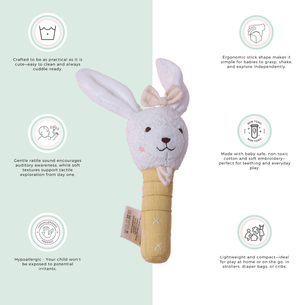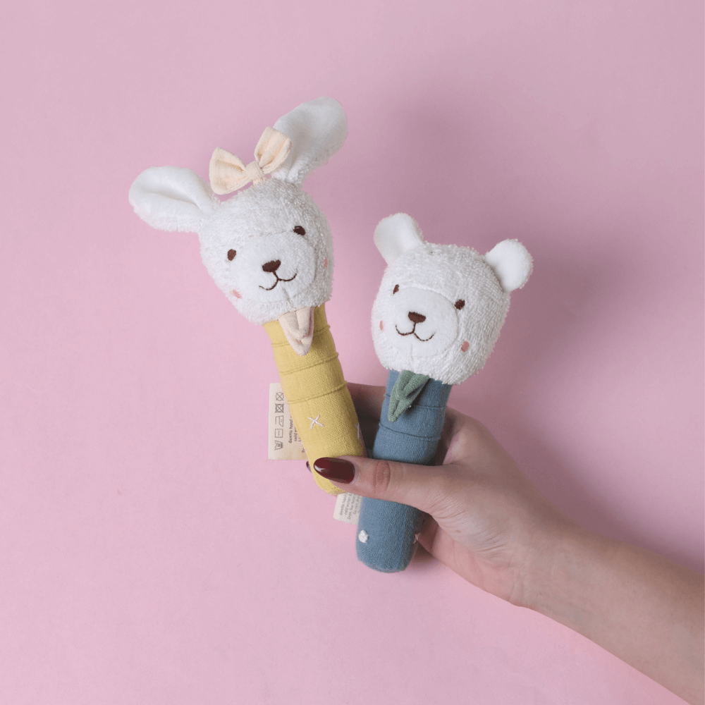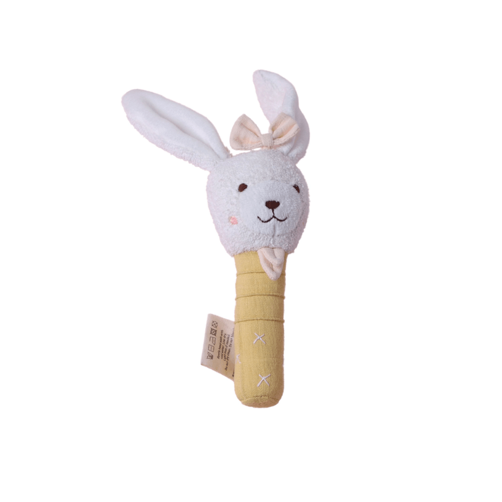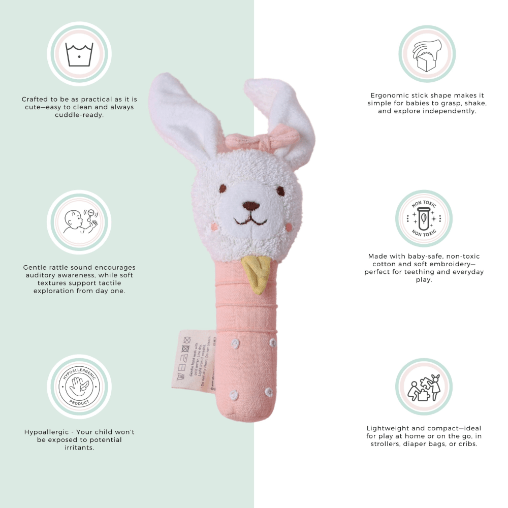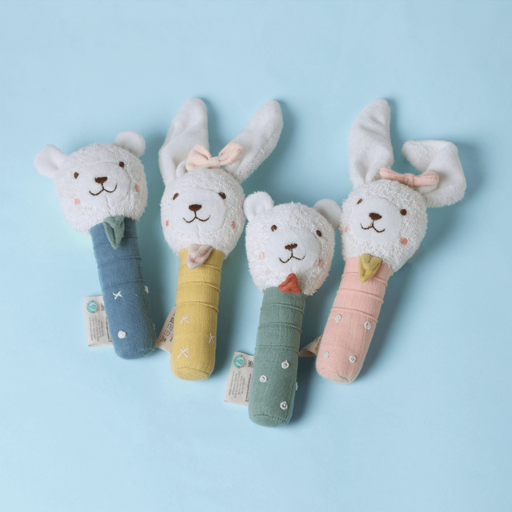 Introduce your little one to their very first friend with our charming collection of hand rattles. Designed to delight babies with every shake, these plush rattles feature gentle sounds, embroidered details, and irresistibly cute animal faces. The easy-to-grip fabric handle is crafted from soft cotton in soothing colours and decorated with delicate stitching. Whether used for playtime, tummy time, or on-the-go entertainment, these rattles encourage sensory development and offer comforting companionship.