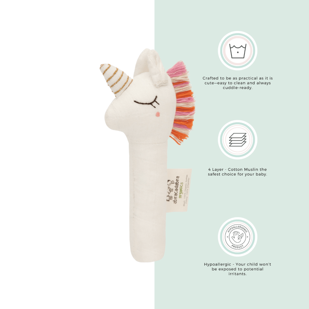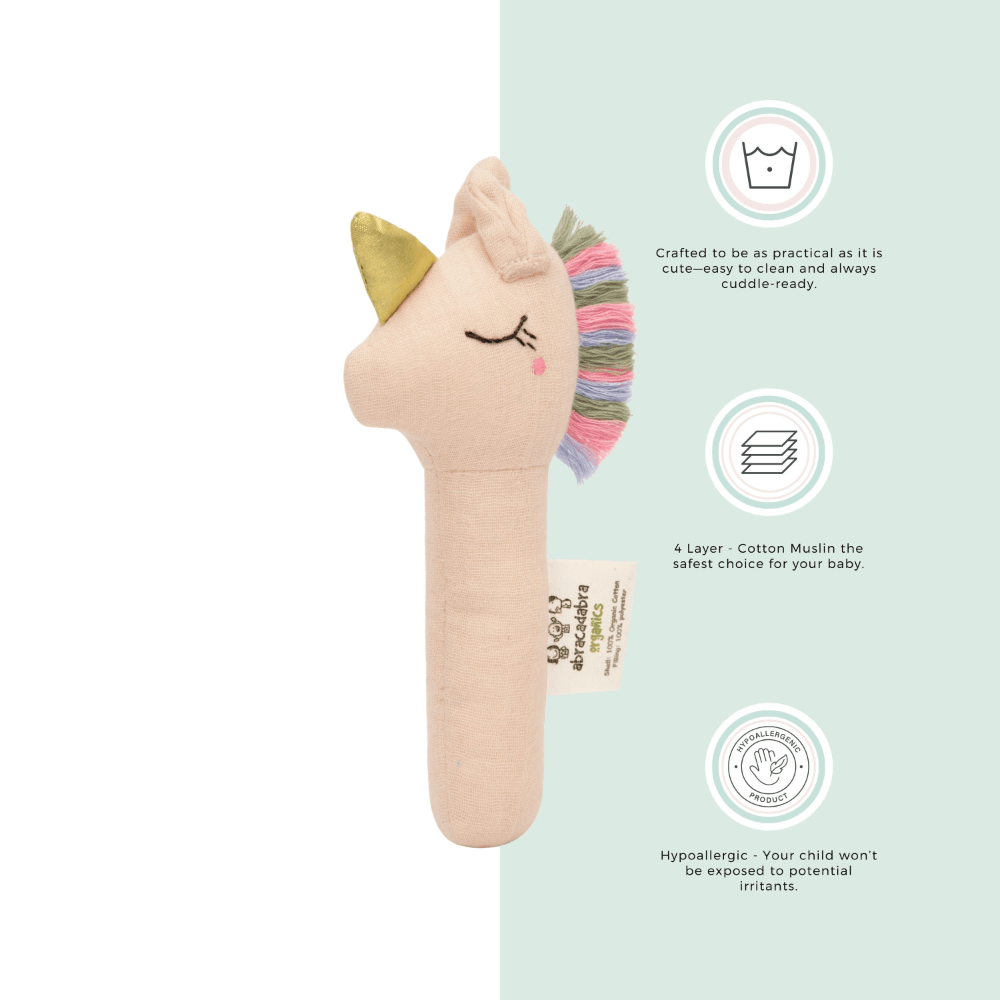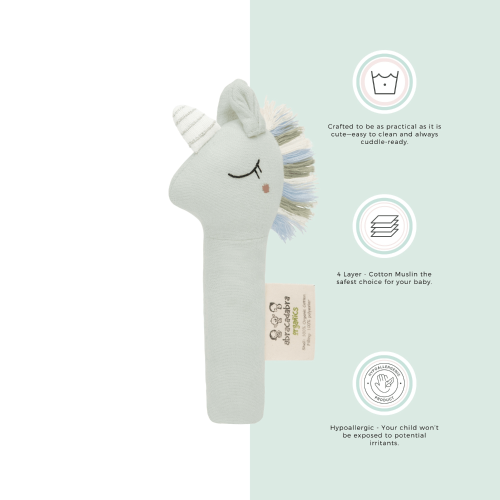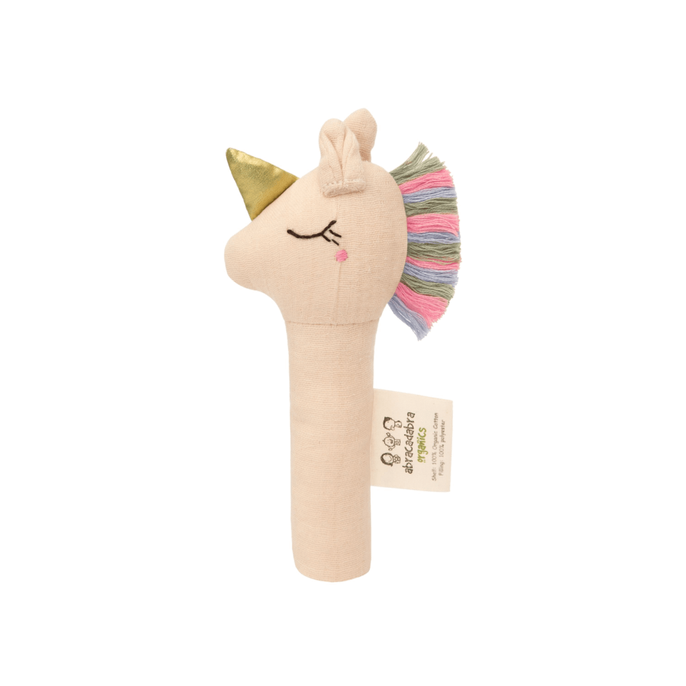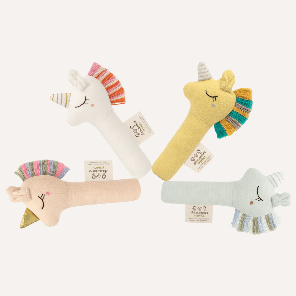 Bring a sprinkle of whimsy to your baby’s playtime with our Unicorn Hand Rattle, made from 100% organic cotton muslin and filled with soft hypoallergenic fibber. The textured mane, made from colourful threads, offers a gentle tactile experience, while the soft rattle sound supports auditory development. Designed for little hands to hold, shake, and explore, this charming rattle stimulates multiple senses while offering a comforting presence. Whether for gifting or everyday play, this unicorn adds magic to every moment. Available in four pastel shades, it’s a keepsake you’ll treasure as much as they do.