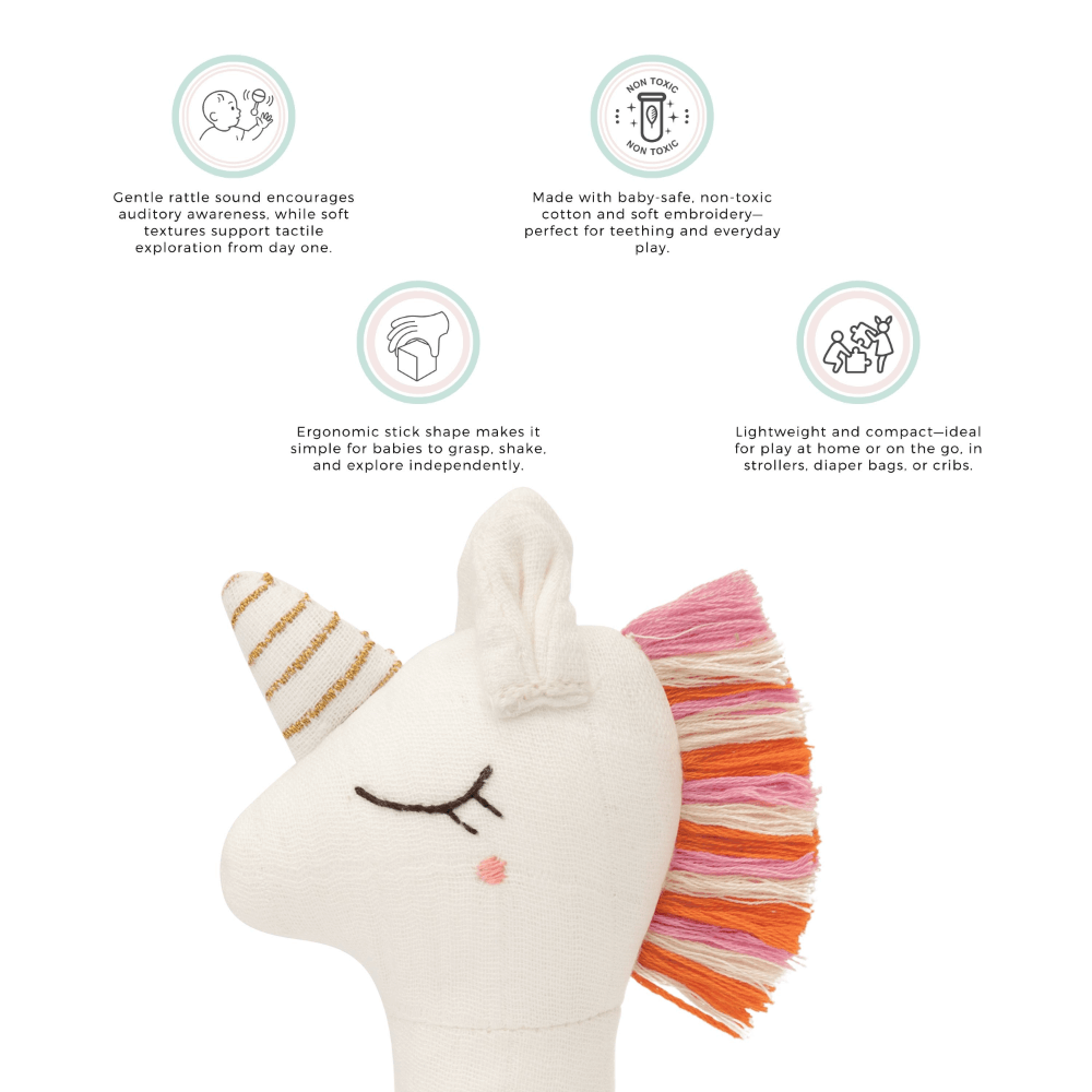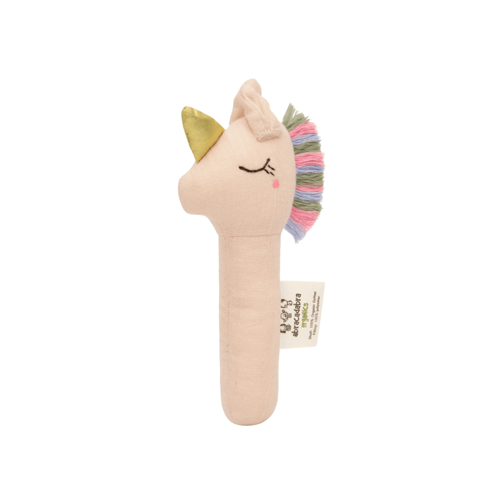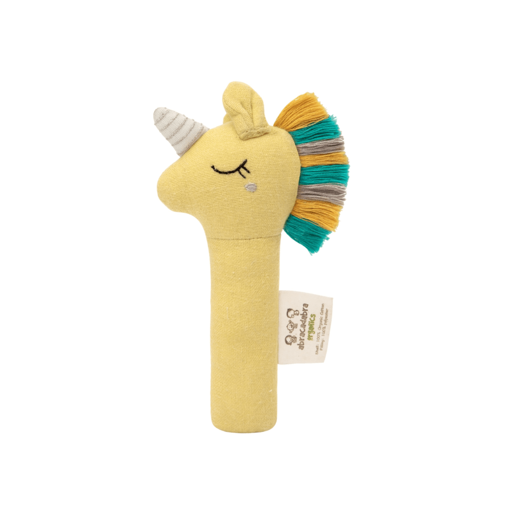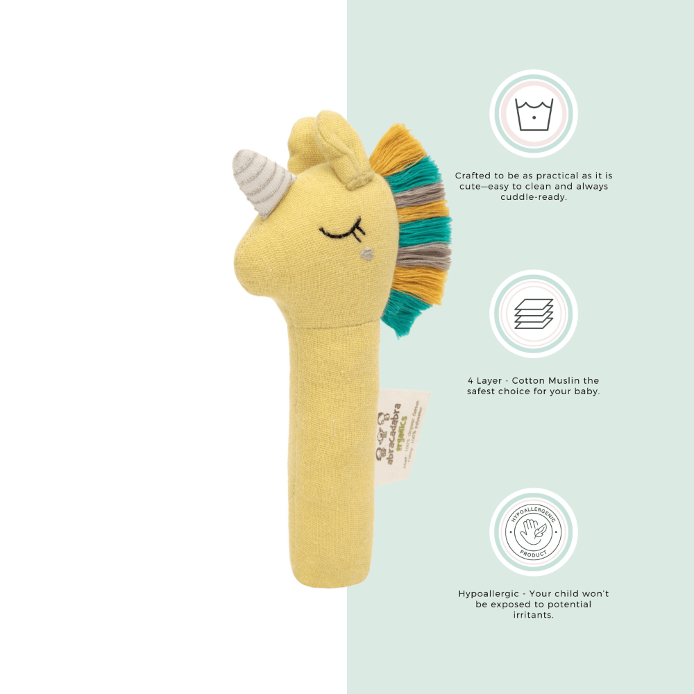 Bring a sprinkle of whimsy to your baby’s playtime with our Unicorn Hand Rattle, made from 100% organic cotton muslin and filled with soft hypoallergenic fibber. The textured mane, made from colourful threads, offers a gentle tactile experience, while the soft rattle sound supports auditory development. Designed for little hands to hold, shake, and explore, this charming rattle stimulates multiple senses while offering a comforting presence. Whether for gifting or everyday play, this unicorn adds magic to every moment. Available in four pastel shades, it’s a keepsake you’ll treasure as much as they do.