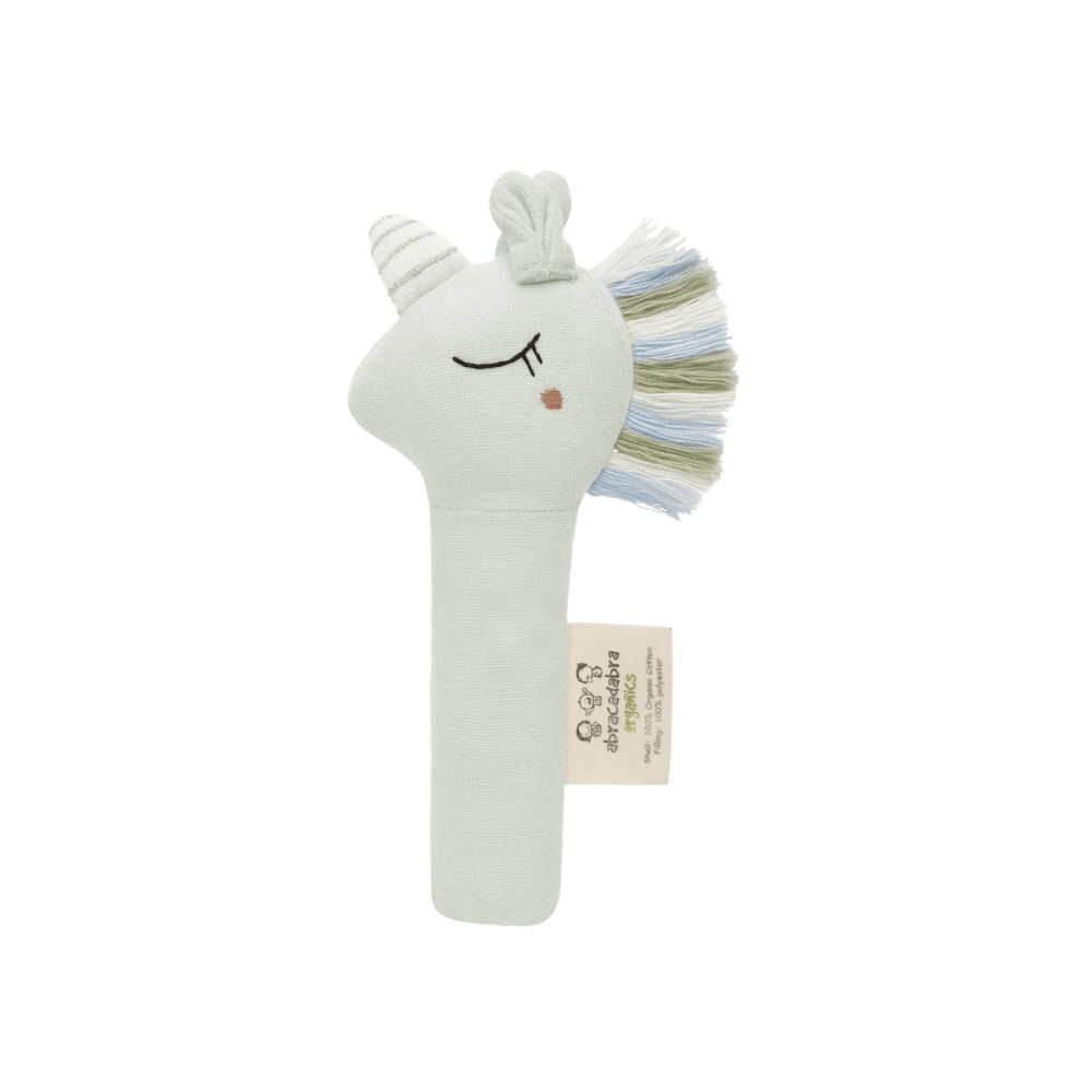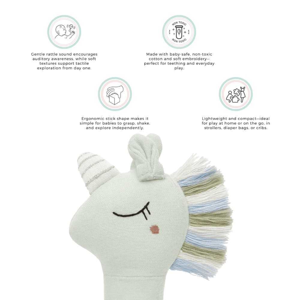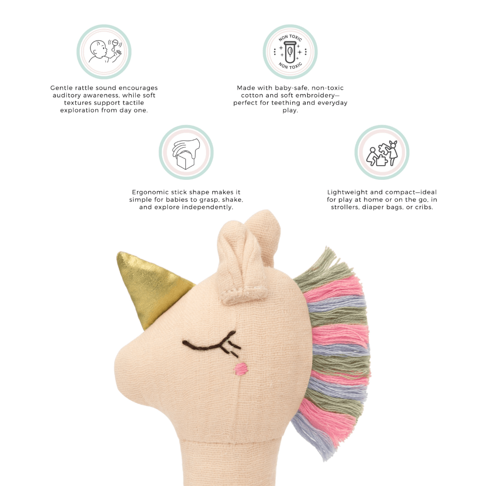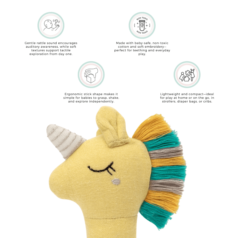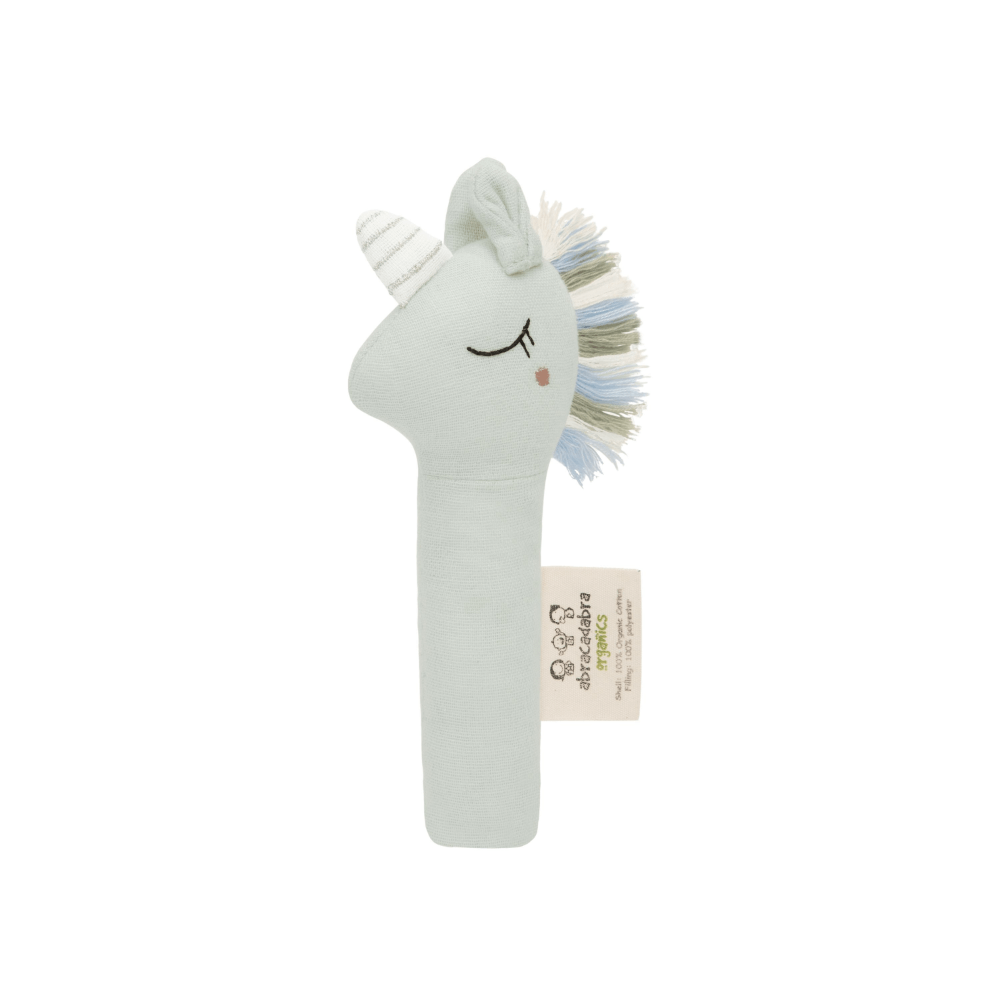 Bring a sprinkle of whimsy to your baby’s playtime with our Unicorn Hand Rattle, made from 100% organic cotton muslin and filled with soft hypoallergenic fibber. The textured mane, made from colourful threads, offers a gentle tactile experience, while the soft rattle sound supports auditory development. Designed for little hands to hold, shake, and explore, this charming rattle stimulates multiple senses while offering a comforting presence. Whether for gifting or everyday play, this unicorn adds magic to every moment. Available in four pastel shades, it’s a keepsake you’ll treasure as much as they do.