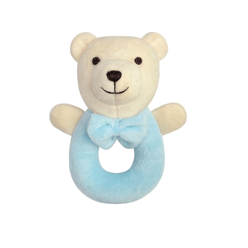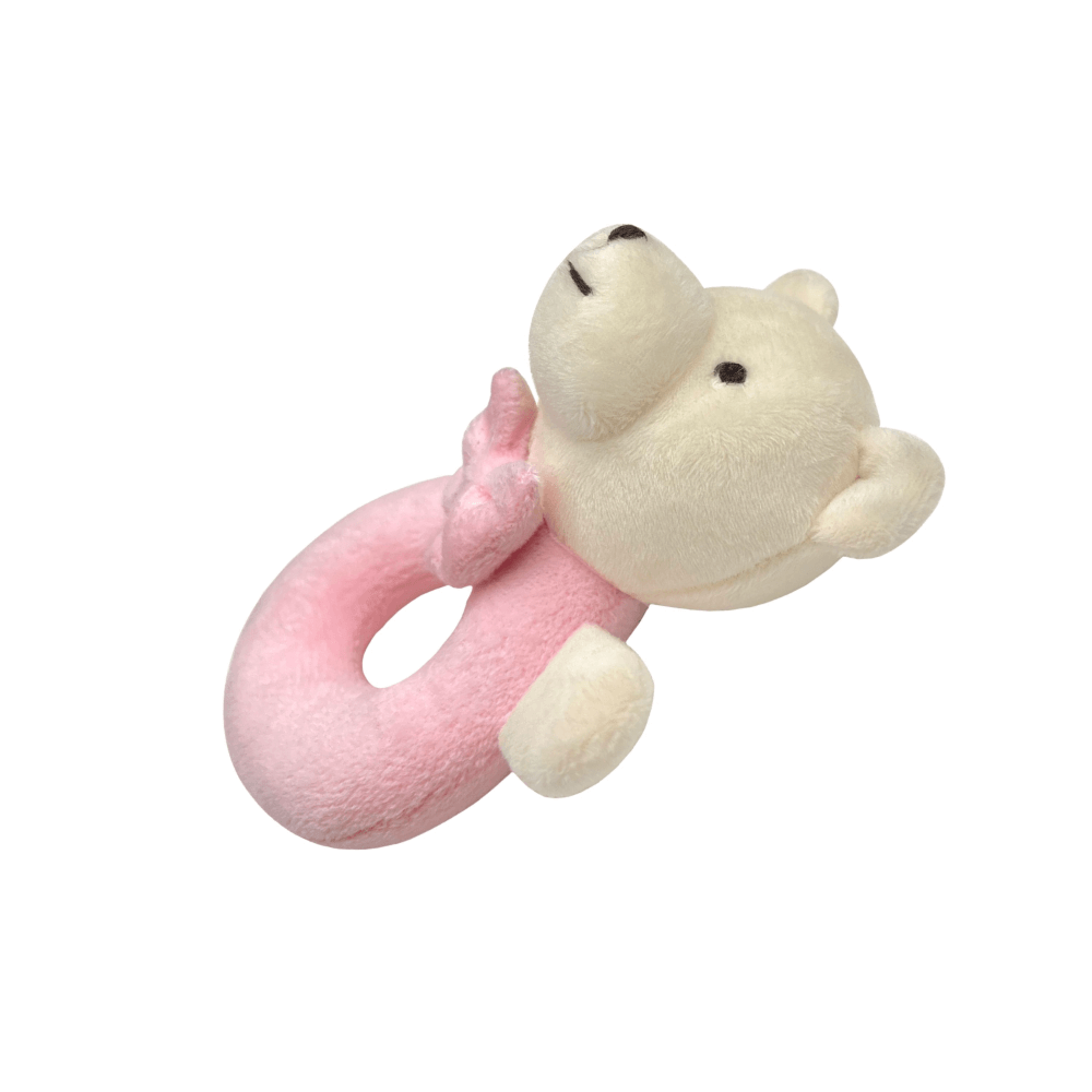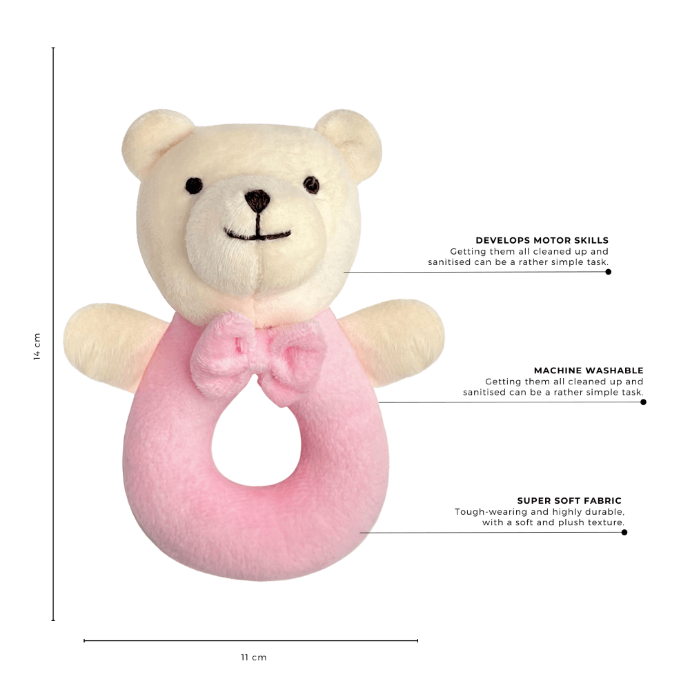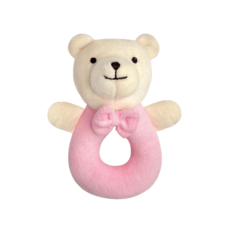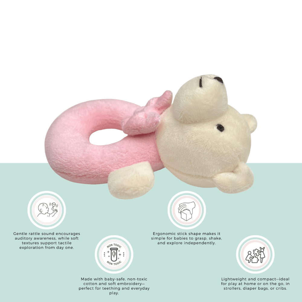 Meet your baby’s first companion — our plush bear ring rattle. Designed in a gentle pastel pink with a friendly embroidered face and a soft bow tie, this rattle is perfect for stimulating your little one’s senses. Its lightweight, open ring shape is easy for small hands to grasp, encouraging early motor skills, hand-eye coordination, and auditory awareness with every gentle shake. Whether at home, in the stroller, or on the go, this bear rattle offers both comfort and quiet entertainment. A timeless baby gift and a nursery essential, it’s made for tiny fingers and treasured beginnings.