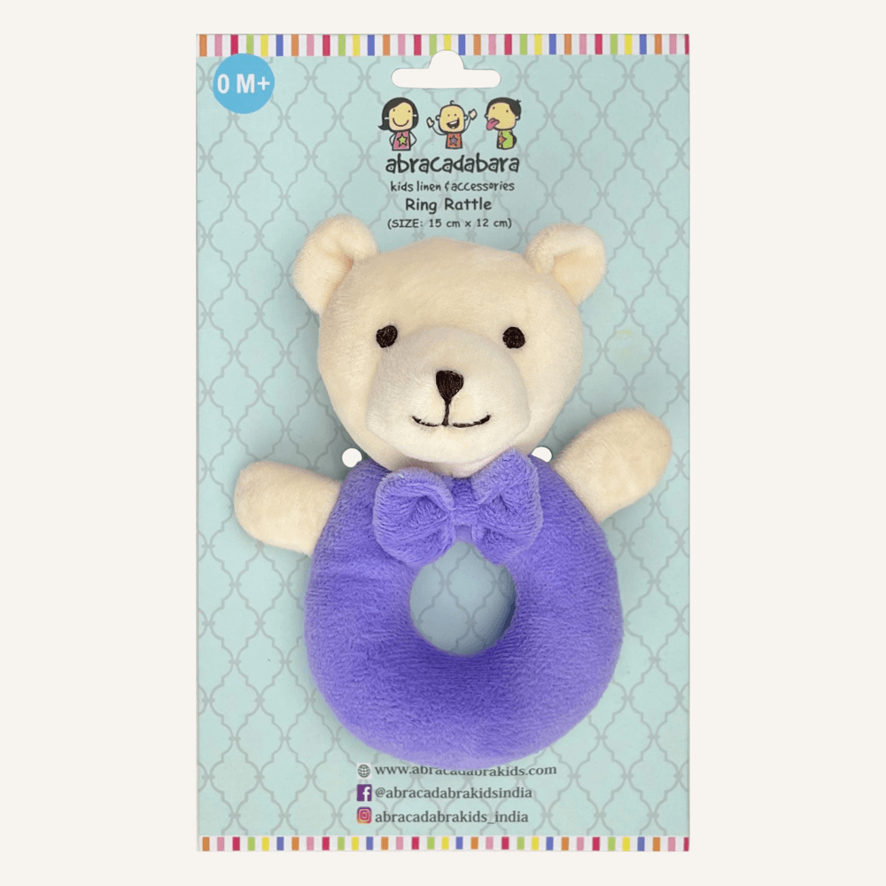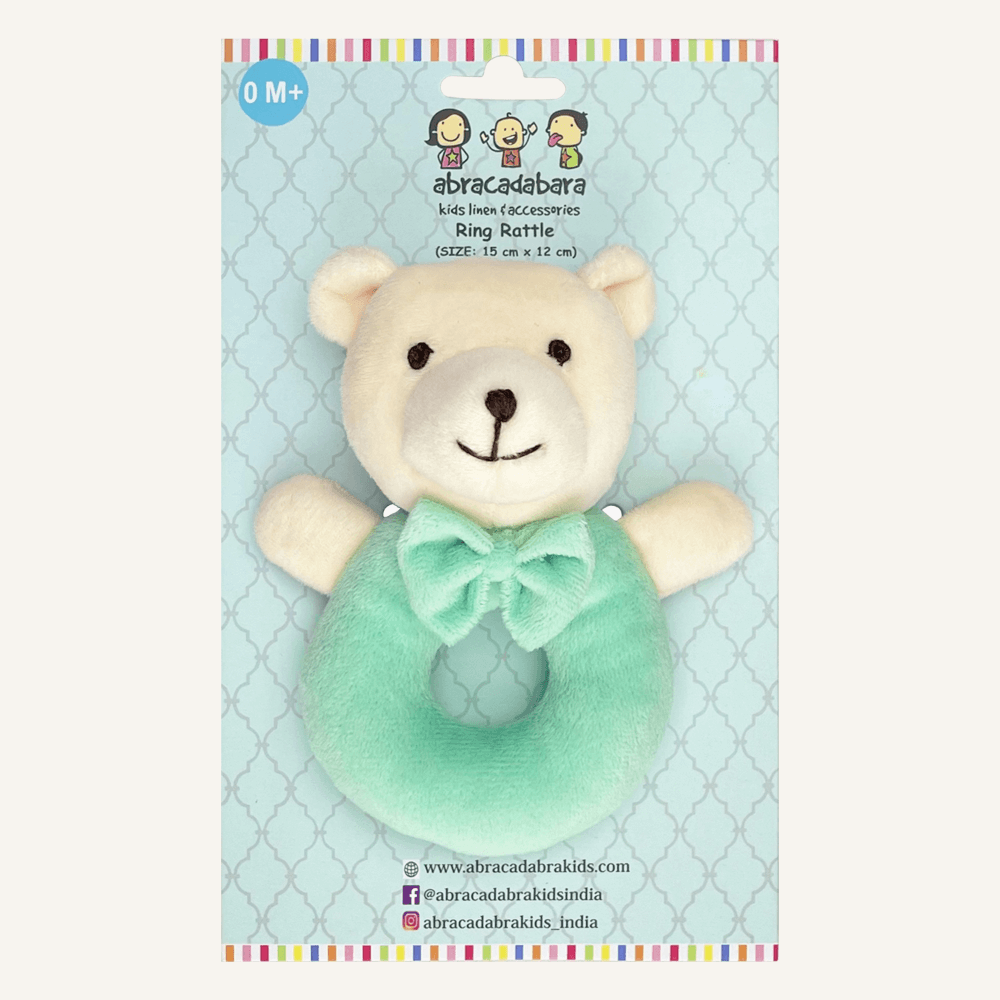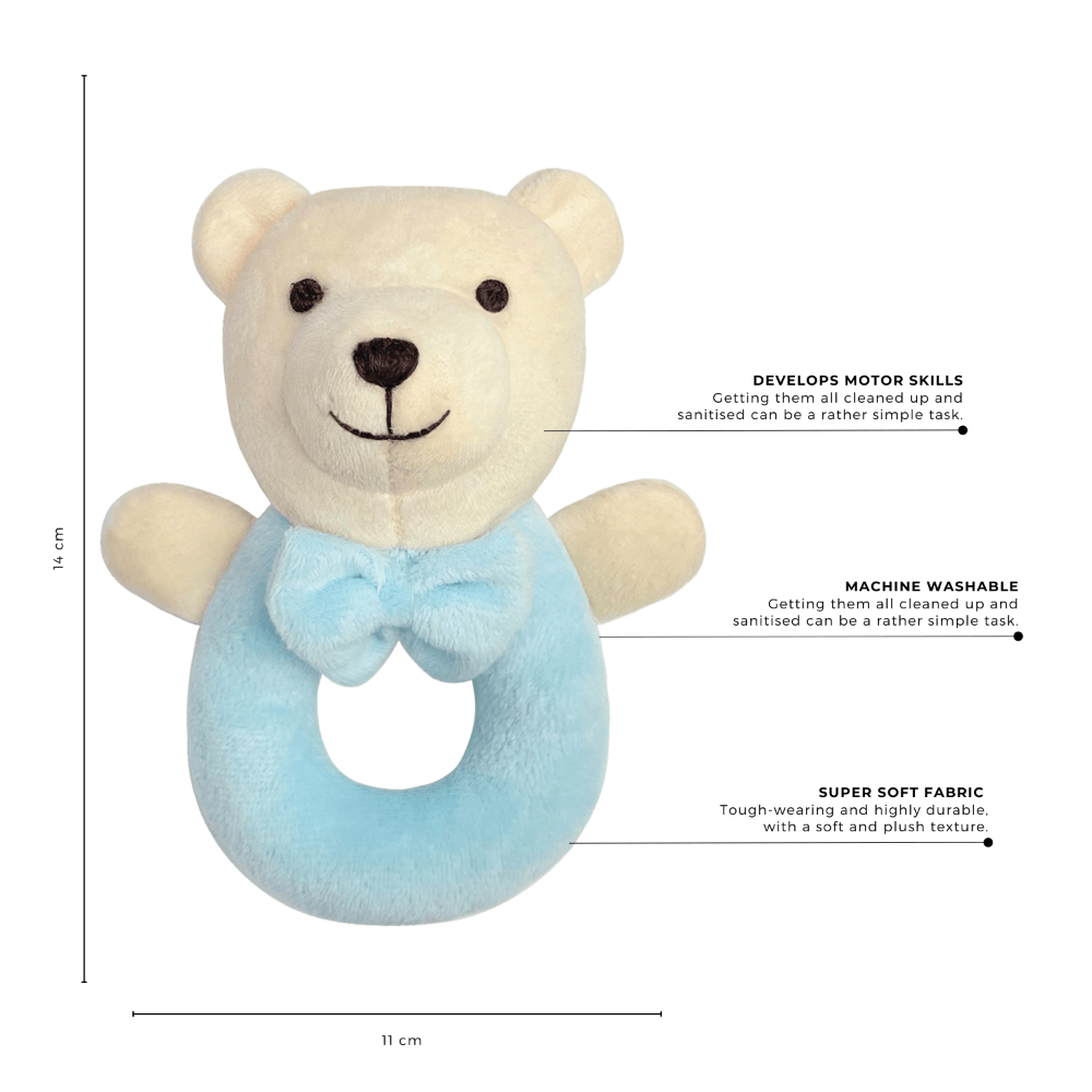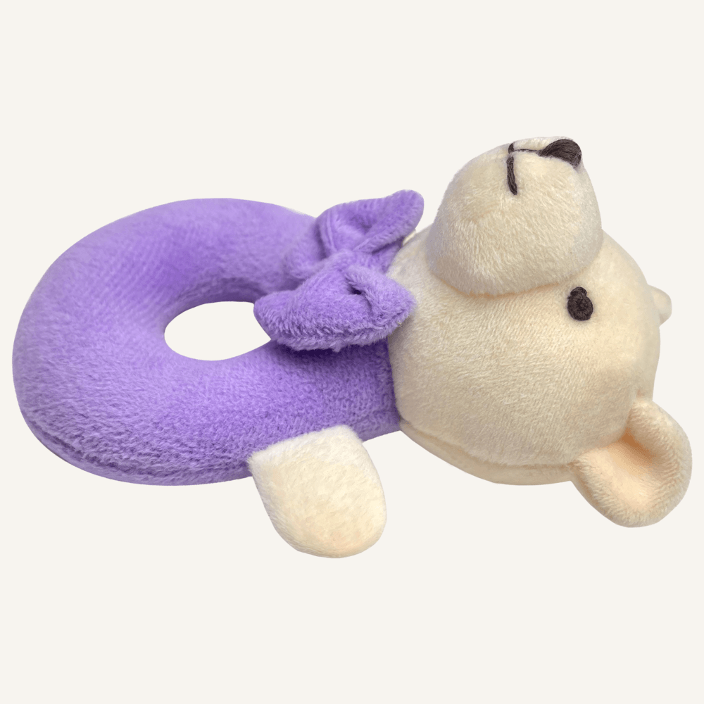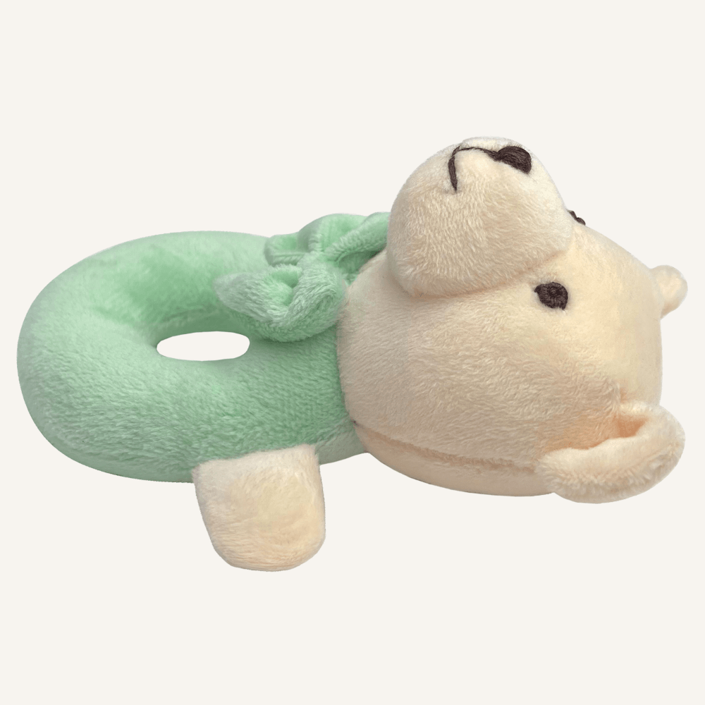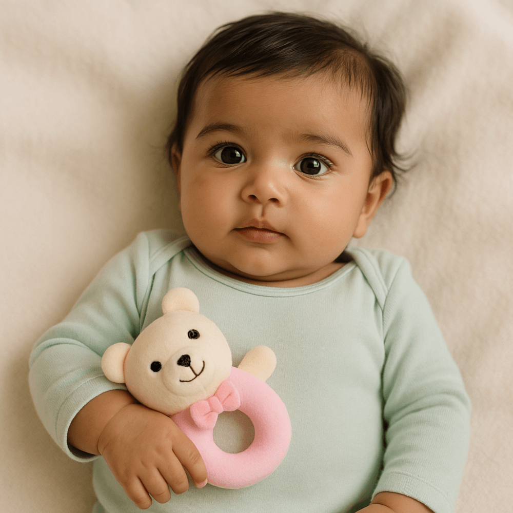 Meet your baby’s first companion — our plush bear ring rattle. Designed in a gentle pastel pink with a friendly embroidered face and a soft bow tie, this rattle is perfect for stimulating your little one’s senses. Its lightweight, open ring shape is easy for small hands to grasp, encouraging early motor skills, hand-eye coordination, and auditory awareness with every gentle shake. Whether at home, in the stroller, or on the go, this bear rattle offers both comfort and quiet entertainment. A timeless baby gift and a nursery essential, it’s made for tiny fingers and treasured beginnings.