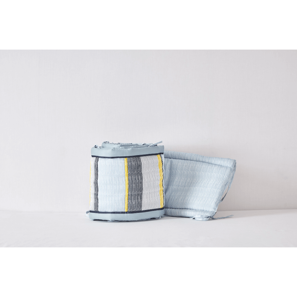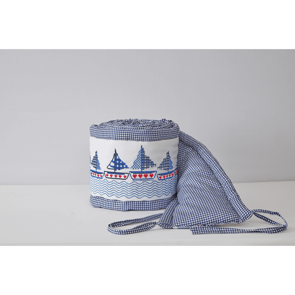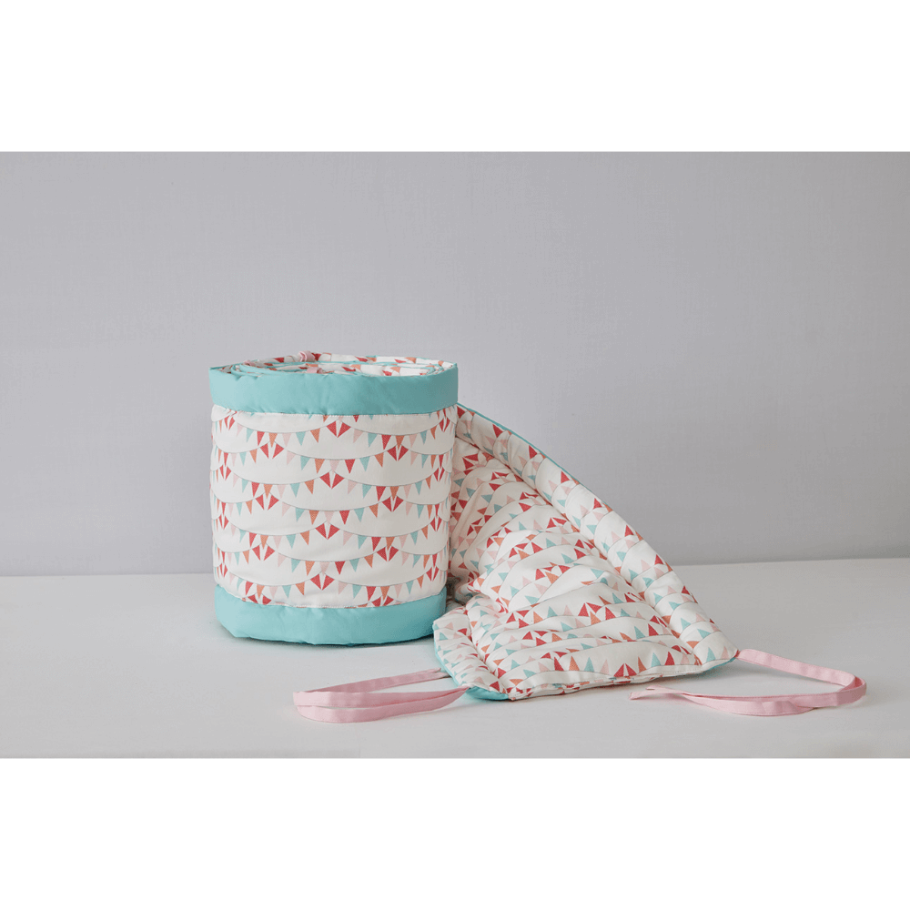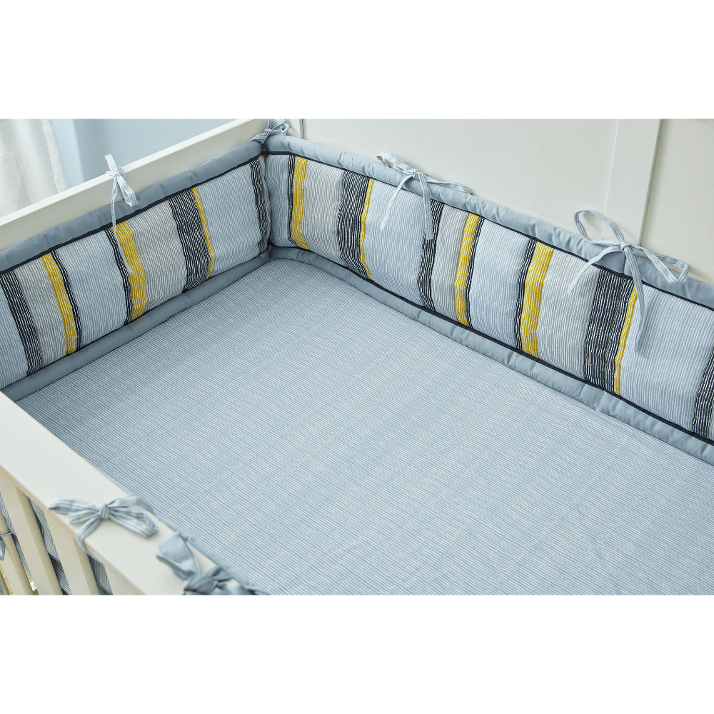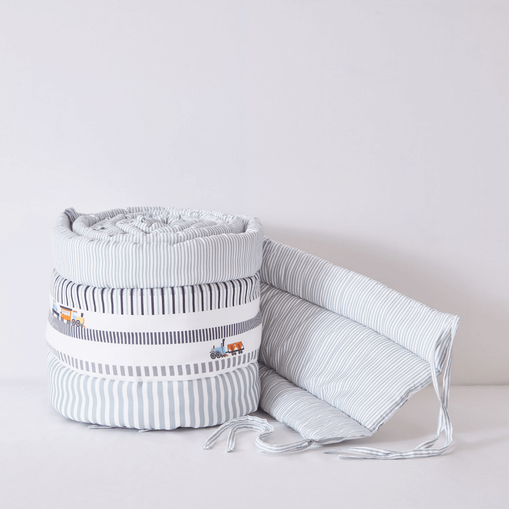 The Cot Bumper Collection brings charm and comfort to every nursery with its playful yet protective designs. Crafted from 100% premium cotton, each bumper is soft, breathable, and gentle on delicate skin while plush padding and quilted stitching provide safety against cot rails. From imaginative space-themed motifs and whimsical parachutes with cloud prints to nautical sailboats with delicate embroidery, every detail adds character and warmth. Bright lemon-inspired patterns with scalloped edges, timeless teddy bear rhymes embroidered with gingham trims, and adventurous train prints with stripe accents make each design unique, while maintaining the same promise of comfort and safety. Designed as a single piece for a snug fit, with secure ties or fasteners to hold it firmly in place, these bumpers combine style, softness, and practicality—creating a cosy and protective sleep space for little ones.