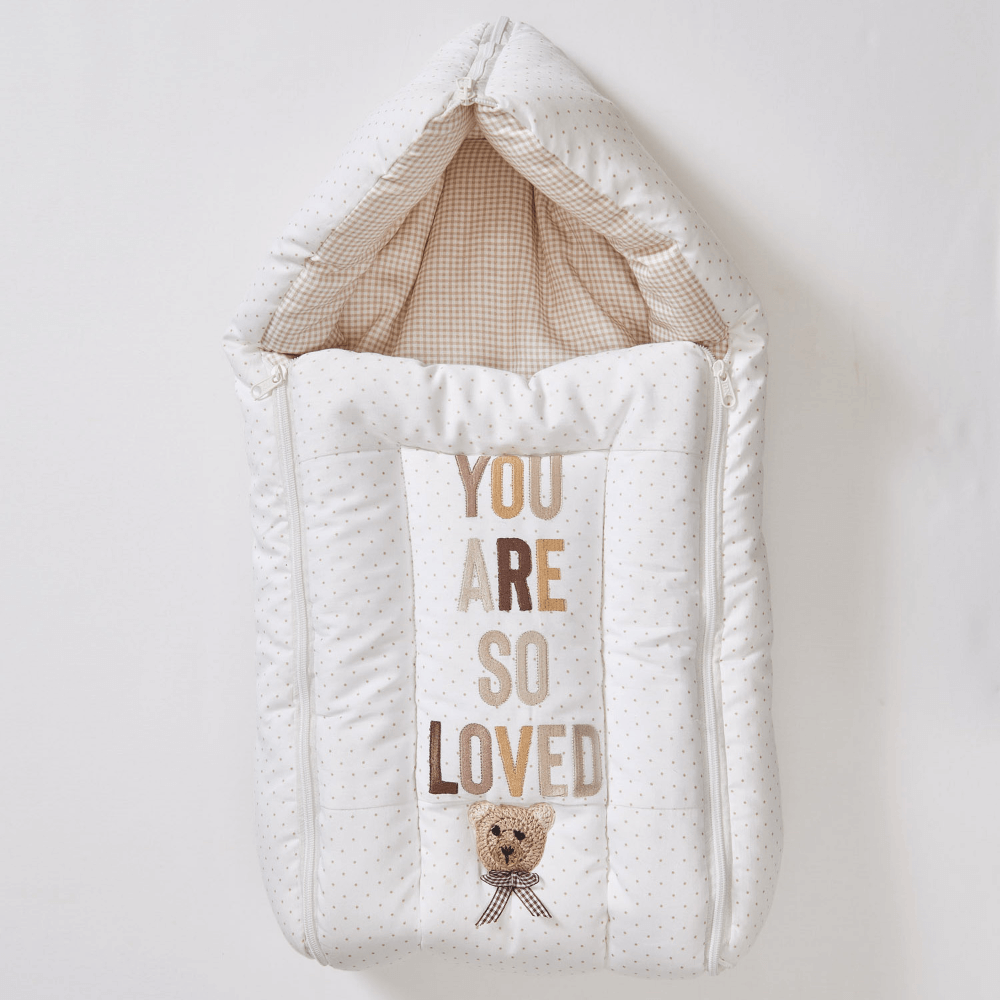 Wrap your little one in ultimate comfort with our Premium Cotton Sleeping Bags, crafted from soft, breathable cotton that ensures cosy naps and restful sleep. Each sleeping bag features a full-length side zipper that opens completely, making diaper changes and cleaning quick and easy. Choose from delightful designs that add charm to your baby's nursery: Blossom with sweet floral motifs, Bunny with playful bunny prints, Butterfly adorned with pastel hues and a delicate floral border, Elephant showcasing adorable elephant designs, Fido featuring whimsical dachshund prints, or Teddy with charming polka dots, a warm checkered lining, and an embroidered "You Are So Loved" message. Softly cushioned interiors provide a secure, snug fit, ensuring your baby stays comfortable and happy from nap time to bedtime.
