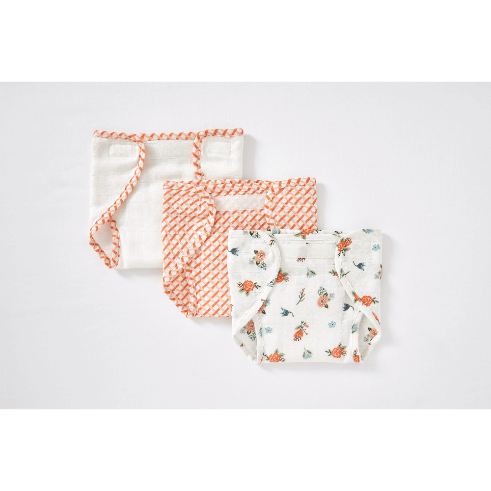Delicate floral muslin nappies in soothing peach and blue tones. Crafted from 100% muslin cotton with a moisture-absorbing towelling layer, keeping baby dry and comfortable. Velcro closures offer a secure fit.