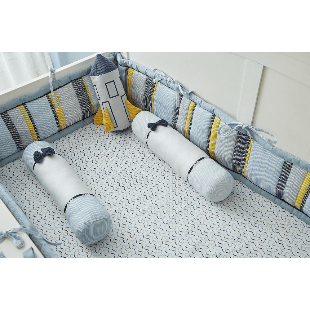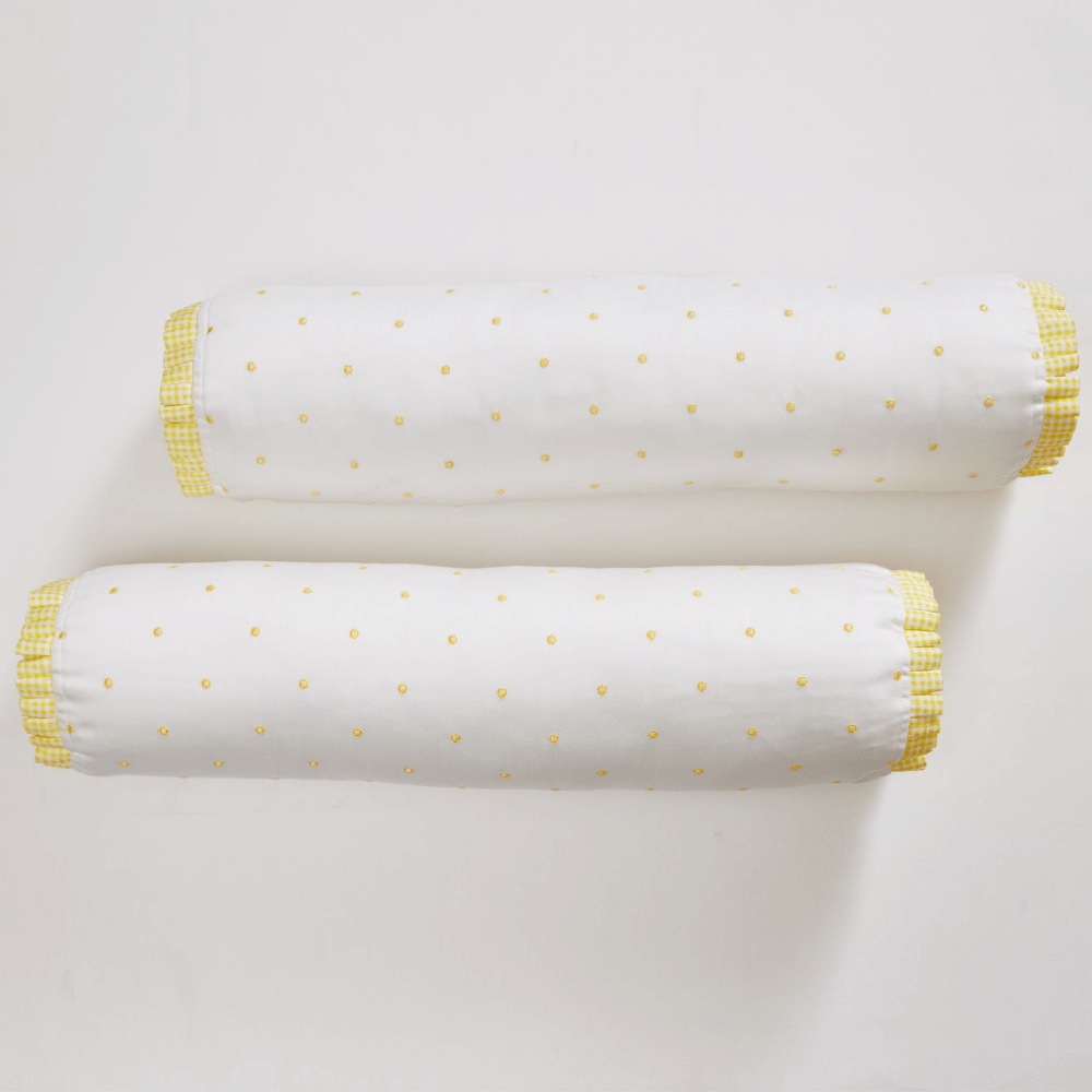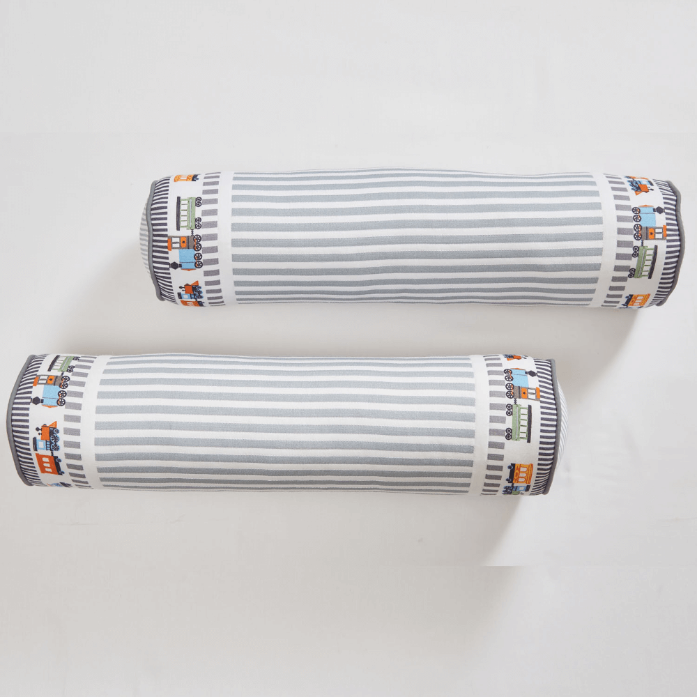 The Bolster Set Collection brings timeless charm and cosy comfort to every nursery, blending playful themes with elegant detailing. Crafted from premium cotton and filled with soft yet supportive cotton fibber, each bolster offers the perfect balance of firmness and coziness—ideal for tummy time, lounging, or everyday support. From vintage-inspired floral embroidery with delicate piping and classic blue stripes with frilled edges to sophisticated navy bows with pinstripes, every design adds a refined touch. Cheerful lemon embroidery with gingham trims, adorable teddy motifs on gingham bases, and playful train patterns with striped accents bring a lively character to the collection. Designed with practicality in mind, each set includes removable covers with concealed or hidden zippers, ensuring effortless cleaning and long-lasting freshness. Combining style, comfort, and function, these bolsters make a perfect addition to your baby’s nursery.