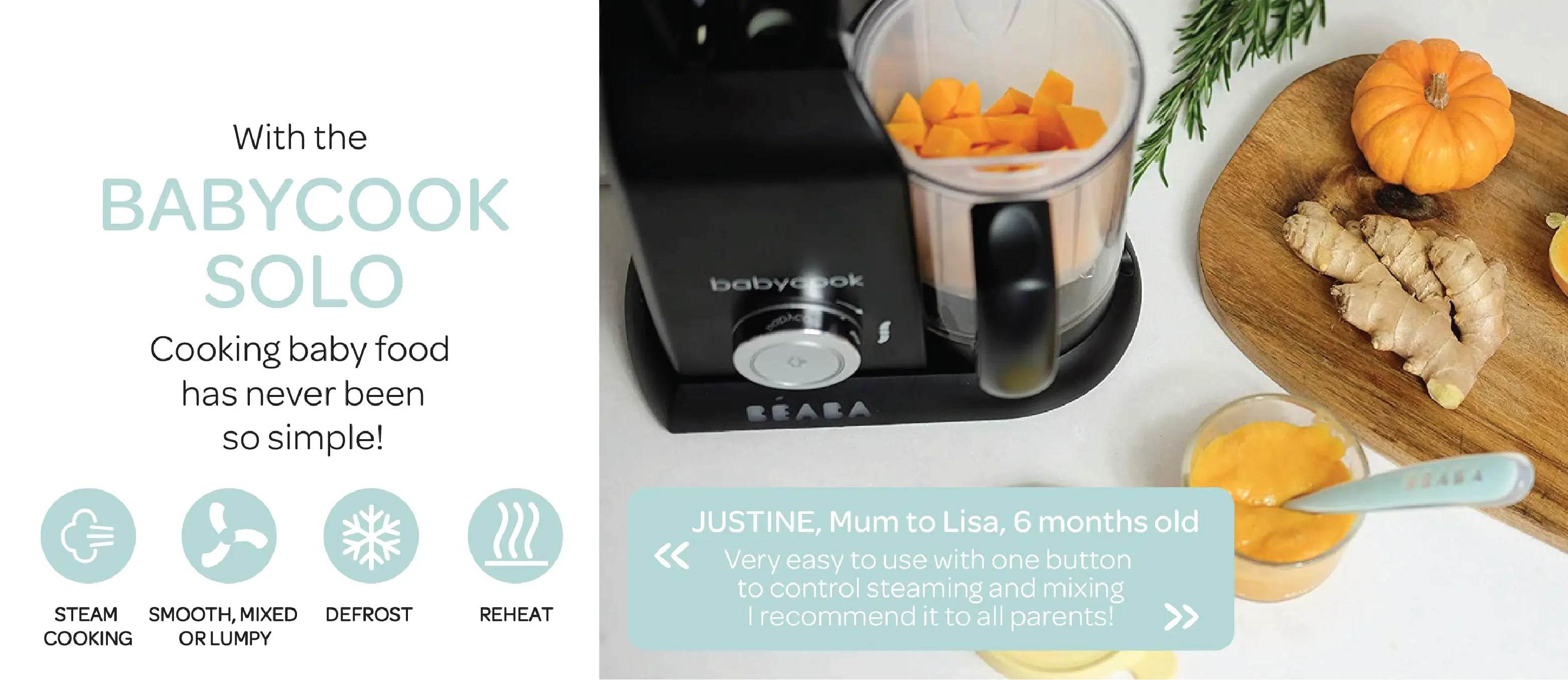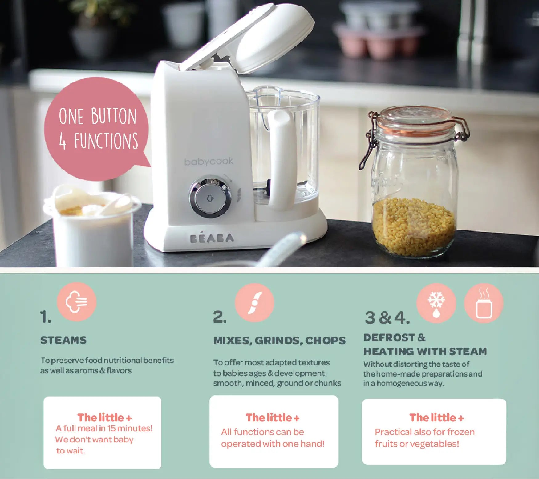 Eliminate the need for pots and blenders with The Beaba Babycook Solo - a multifunctional baby food maker that makes mealtime easy and hassle-free. Suitable from birth with bottle sterilization and warming features that evolves with your baby as they start solids. Steam, blend, and cook vegetables, fruits, dal, rice, khichdi, pasta, chicken, hummus, and much more with just one button. The soft steaming method helps preserves nutrients while the stainless steel blades allows you to blend easily to your desired consistency from smooth to chunky purees. The Babycook solo is travel friendly and designed with an auto shut-off functionality that avoids overcooking or the need to keep checking. It is a one pot baby food cooker that aids and simplifies your baby's feeding journey.
