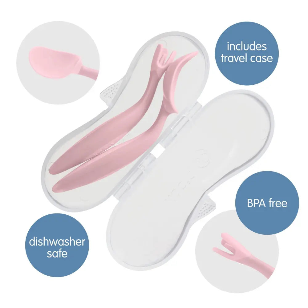 Our cutlery set has been designed with a leading paediatric occupational therapist (OT) as the ideal toolkit for tots who are ready to self feed. The unique spoon shape acts as shovel helping little ones to scoop up their food, even with a flat plate. The unique deep scoop spoon shape and angled handles encourages correct hand to mouth positioning, and helps to contain food within the spoon as bubs practices bringing it to his/her mouth, which means more food makes it to the mouth and less mess! Our unique fork has been designed to fit the size and shapes of little mouths. Its curved blunt prongs are gentler (and safer) on little mouths and gums. Set comes complete with a handy travel case to keep utensils clean before mealtime on the go, and after to prevent soiling in nappy bags or hand bag.